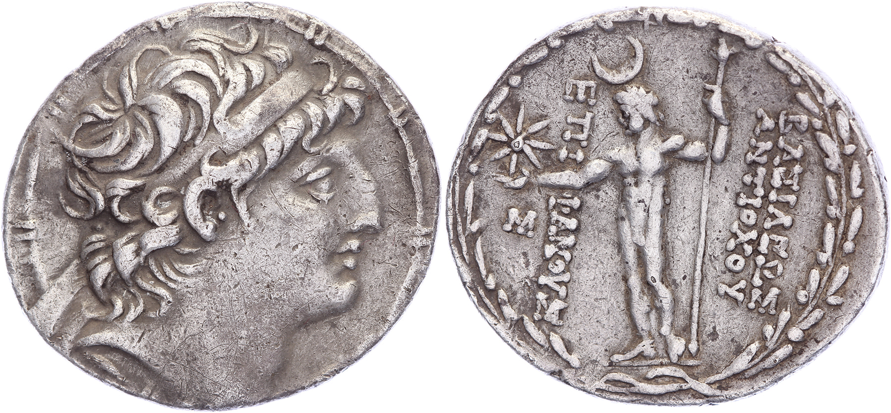 AR Tetradrachm [15,98 gm, 30,6 mm]. Ptolemais-Ake mint. Struck 121/0-113 BC. Diademed head to right / BAΣIΛEΩΣ ANTIOXOY EΠIΦANOYΣ, Zeus Ouranios, naked, standing facing, head to left, holding star in outstretched hand and long scepter, crescent above; to left, M. HGC 9, 1196g. SC 2335.2a. Few marks, Toned VF.