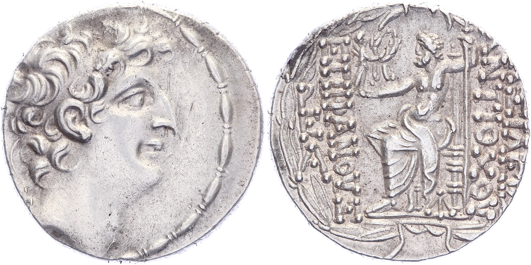AR Tetradrachm [16,39 gm, 26,7 mm]. Antiochia on the Orontes. Struck 109-96 BC. Diademed head right within fillet border / ΒAΣΙΛEΩΣ ΑNTIOXOY EΠIΦANOYΣ, Zeus Nikephoros seated left, holding sceptre; PE monogram above A in outer left field, control mark under throne. SC 2309.2c. gVF.Purchased from Bertolani, Fine Arts London, July 2017