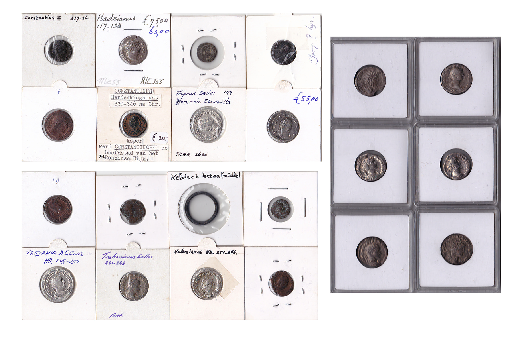 Doosje (22) diverse romeinse munten. Brons en zilver.