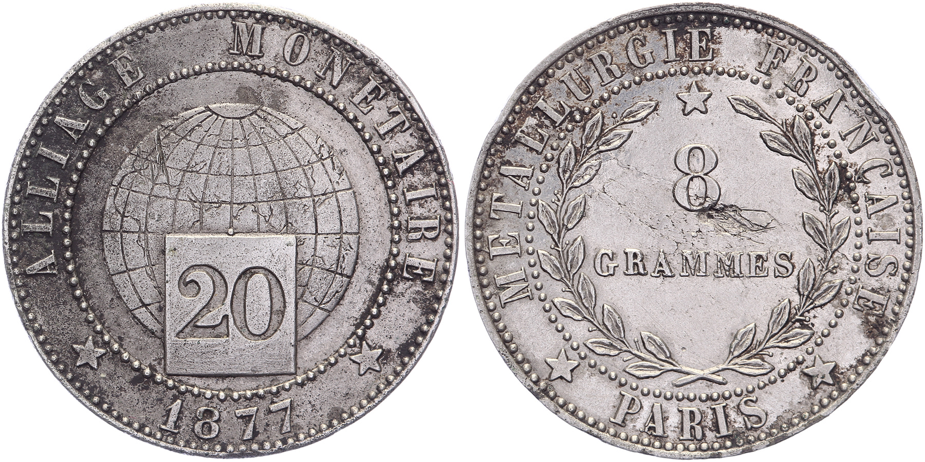 20 Centimes 1877 Essai d’allige. Nr. 20 above globe. / Text and weight of 8 grams. Nickel 26 mm., VG 3899var. VF.