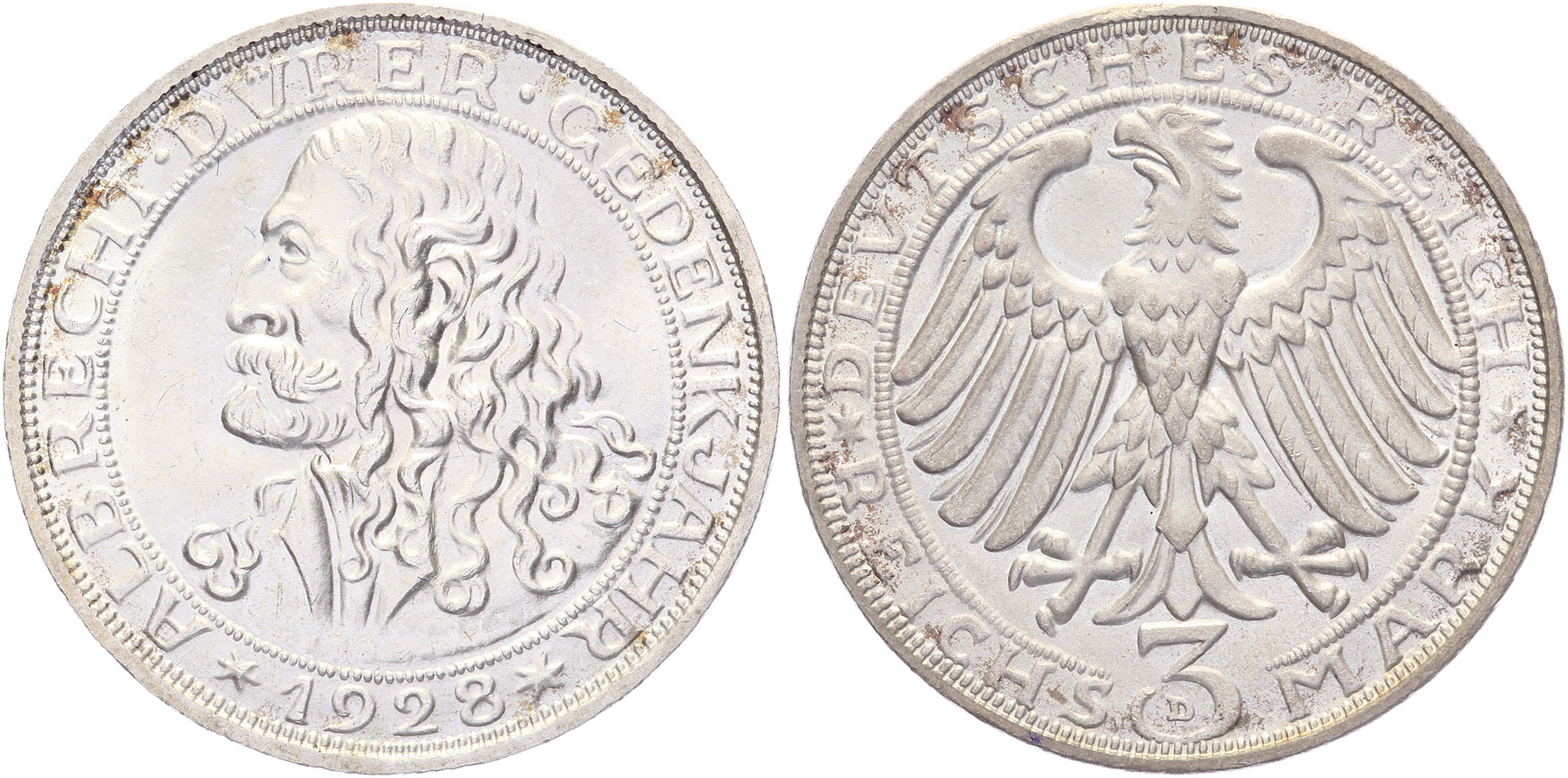 3 Reichsmark 1928D Dürer. Jaeger 332; KM 58. Fast unzirkuliert.