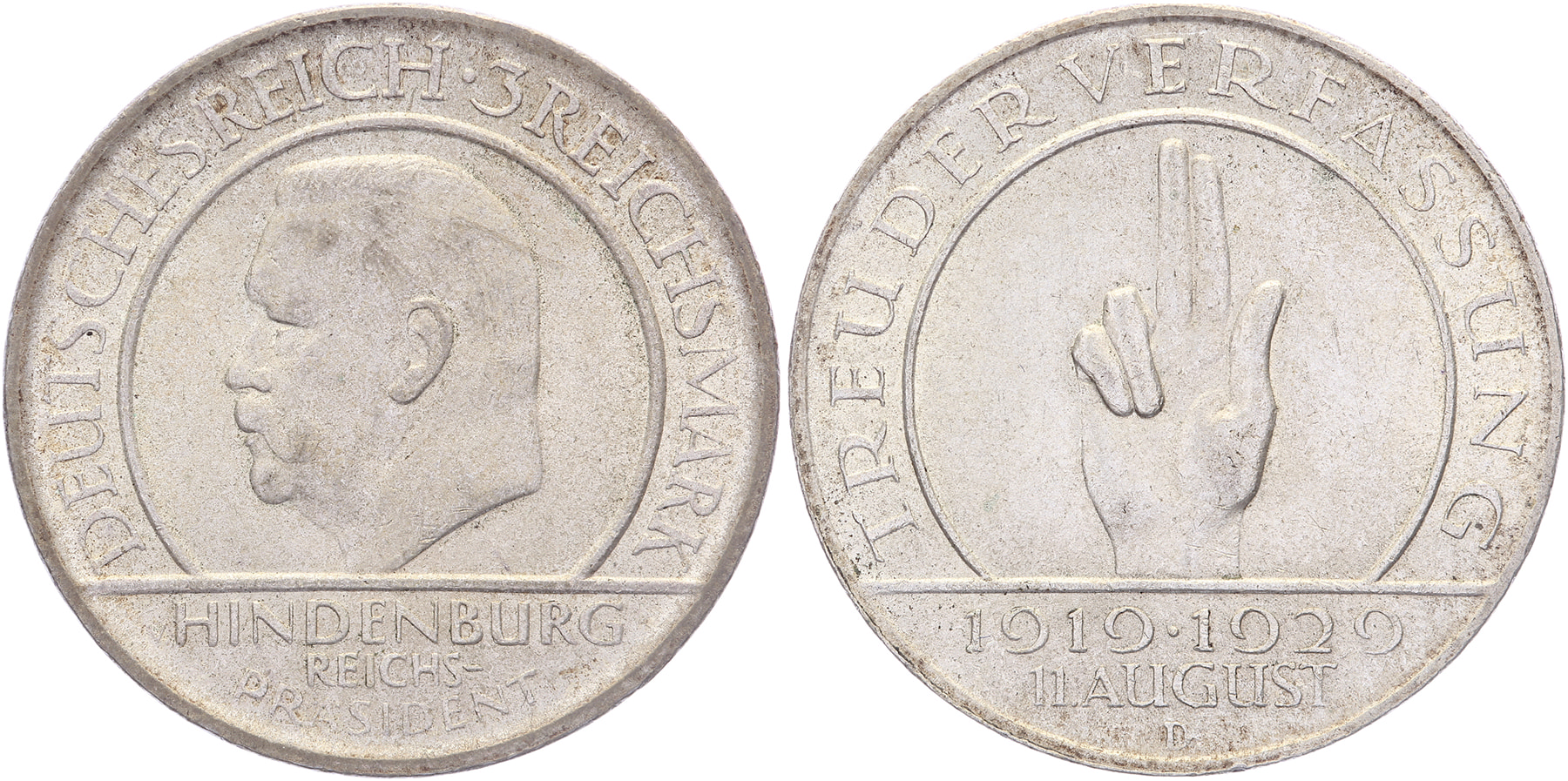 3 Reichsmark 1929D Schwurhand. Jaeger 340; KM 63. Vorzüglich.