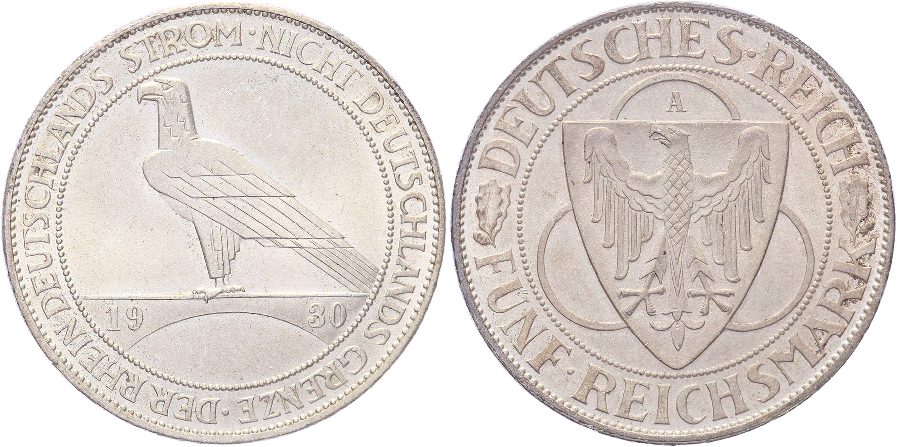 5 Reichsmark 1930A Rheinland. Jaeger 346; KM 71. Vorzüglich / Stemeplglanz.