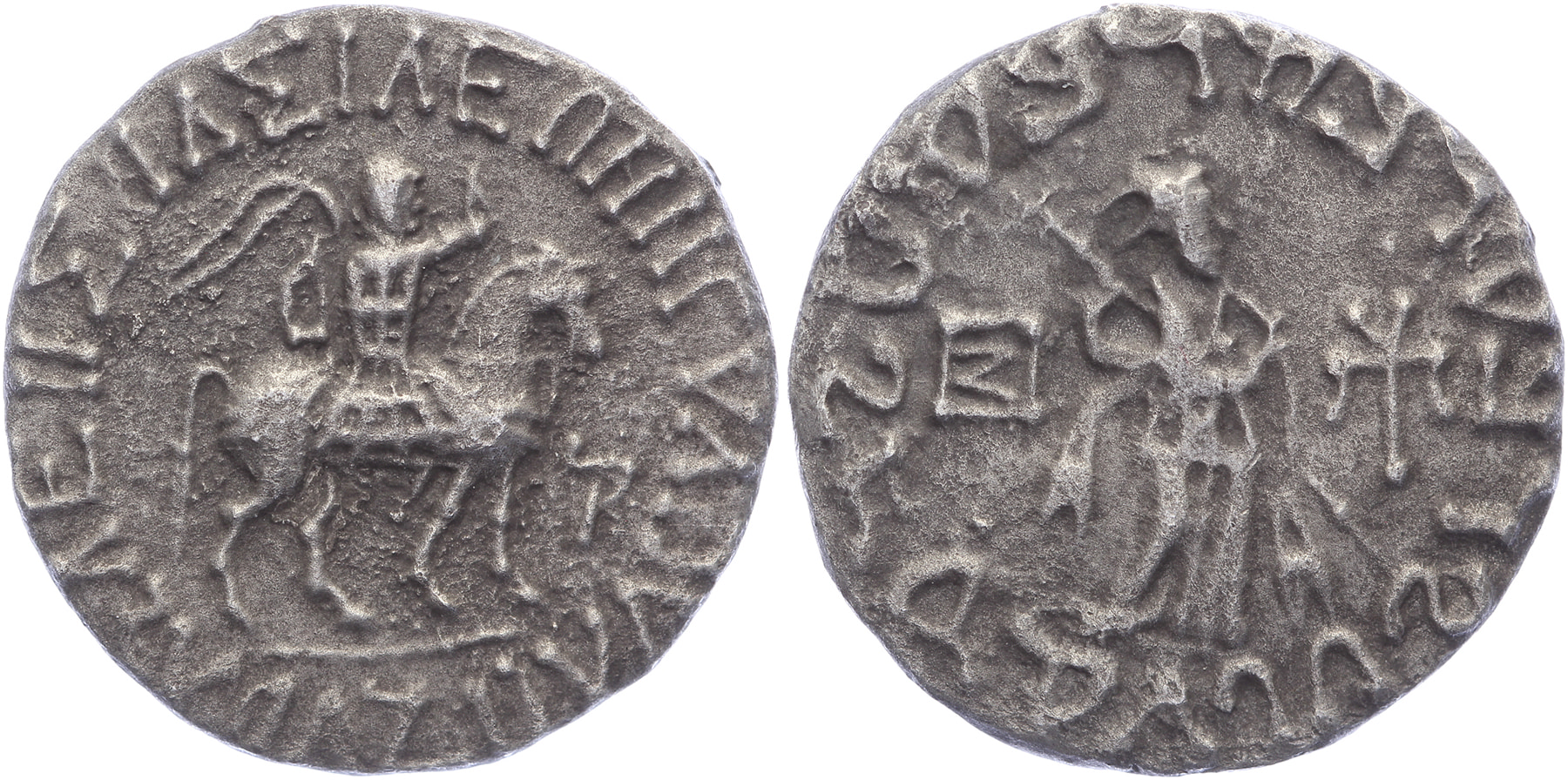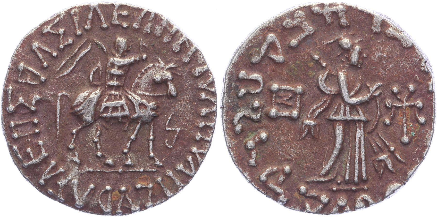 Lot (2) AR Tetradrachm (7.68 gm; 9.49 gm) King on horseback to right / Athena standing right, holding spear and shield. Monogram to left and right. Uncertain mint in western Gandhara. Hoover 637; Senior 98.441, 98.443. aVF.