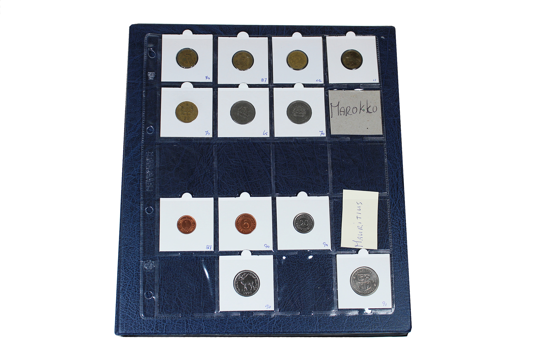 Blauw HB-album met wereldmunten, vooral Afrika. Ruim 180 stuks.