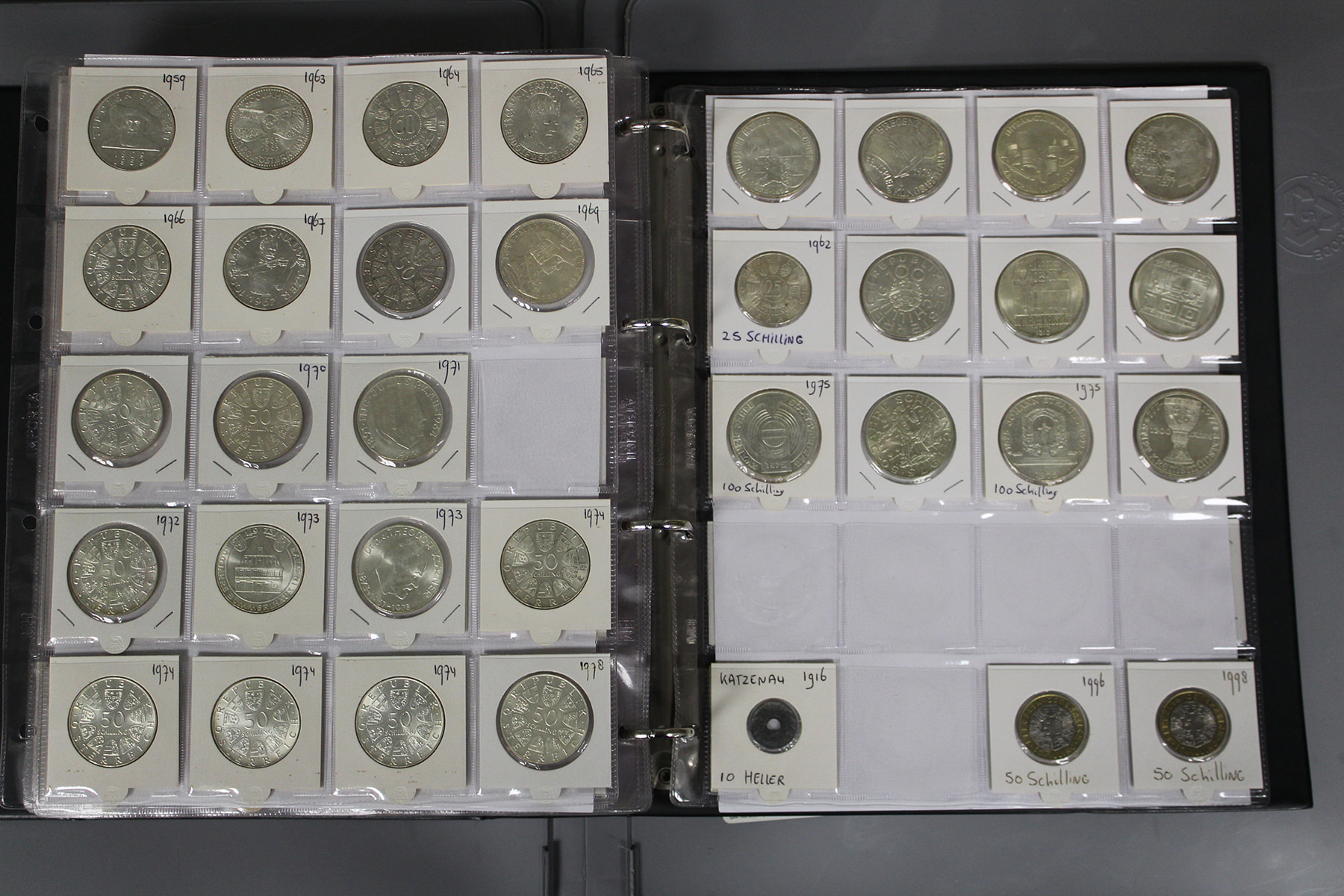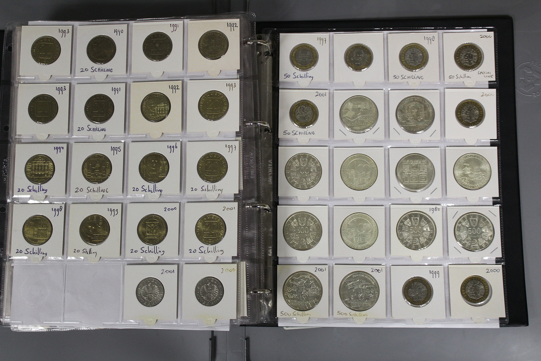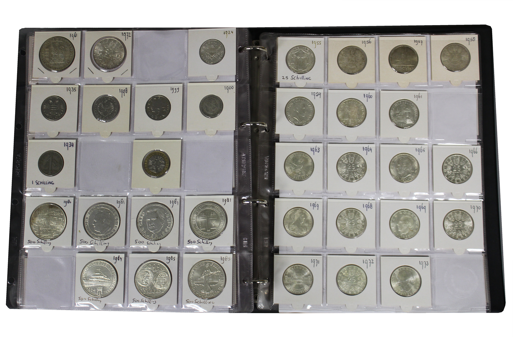 Album met voornamelijk Oostenrijk. O.a. 25 - 50 - 100 en 500 Sh. Ca. 550 stuks. Ca. 6 kg.