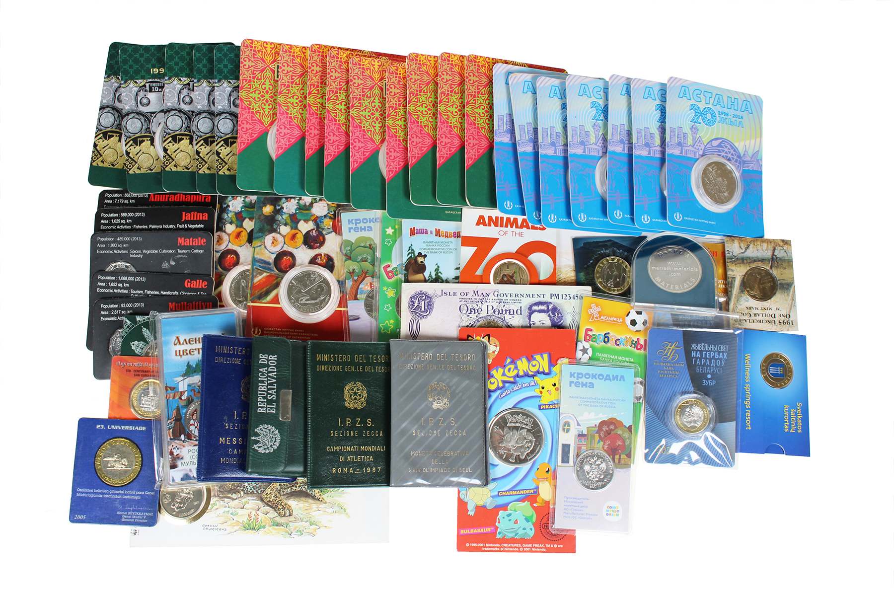 Doos met ruim 50 stuks wereldmunten. Speciale uitgiften in de nog originele verpakking. UNC en proof.