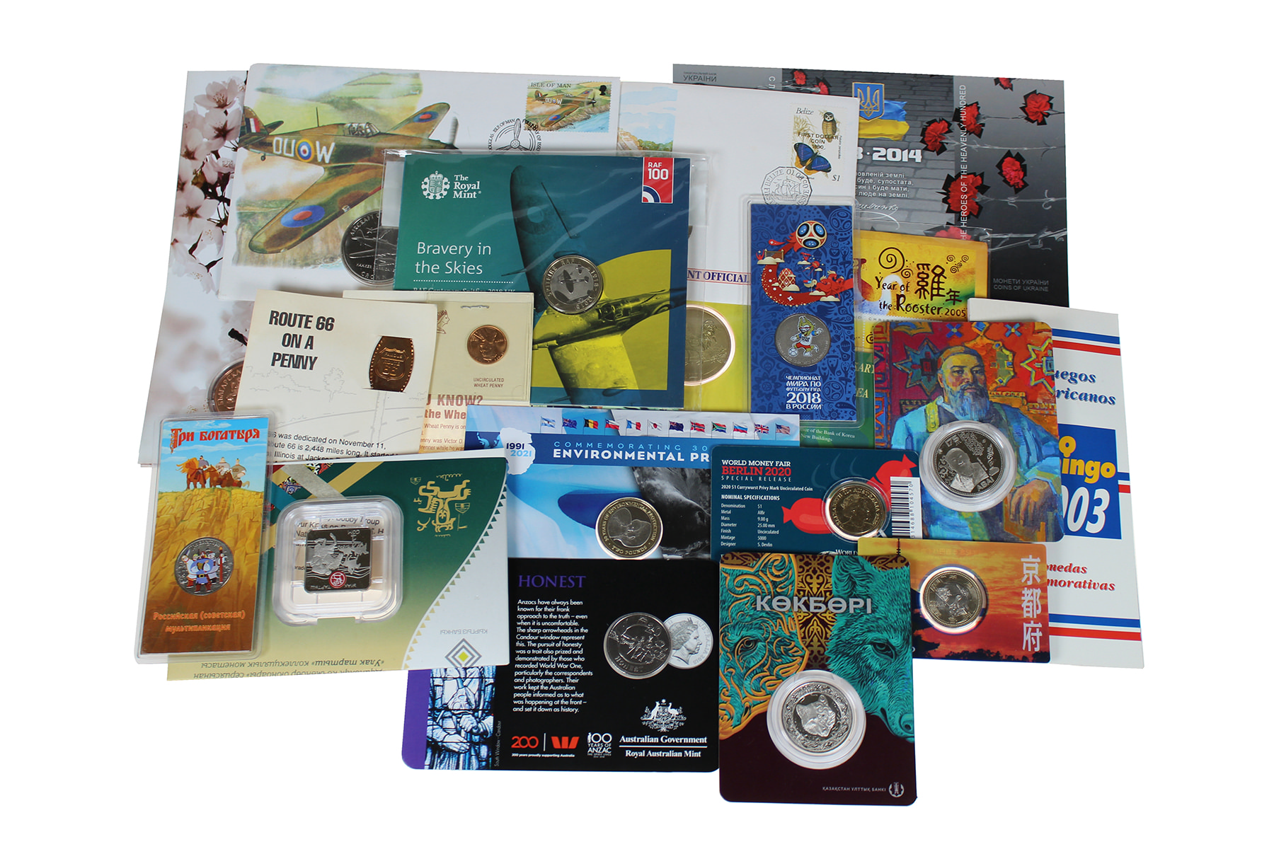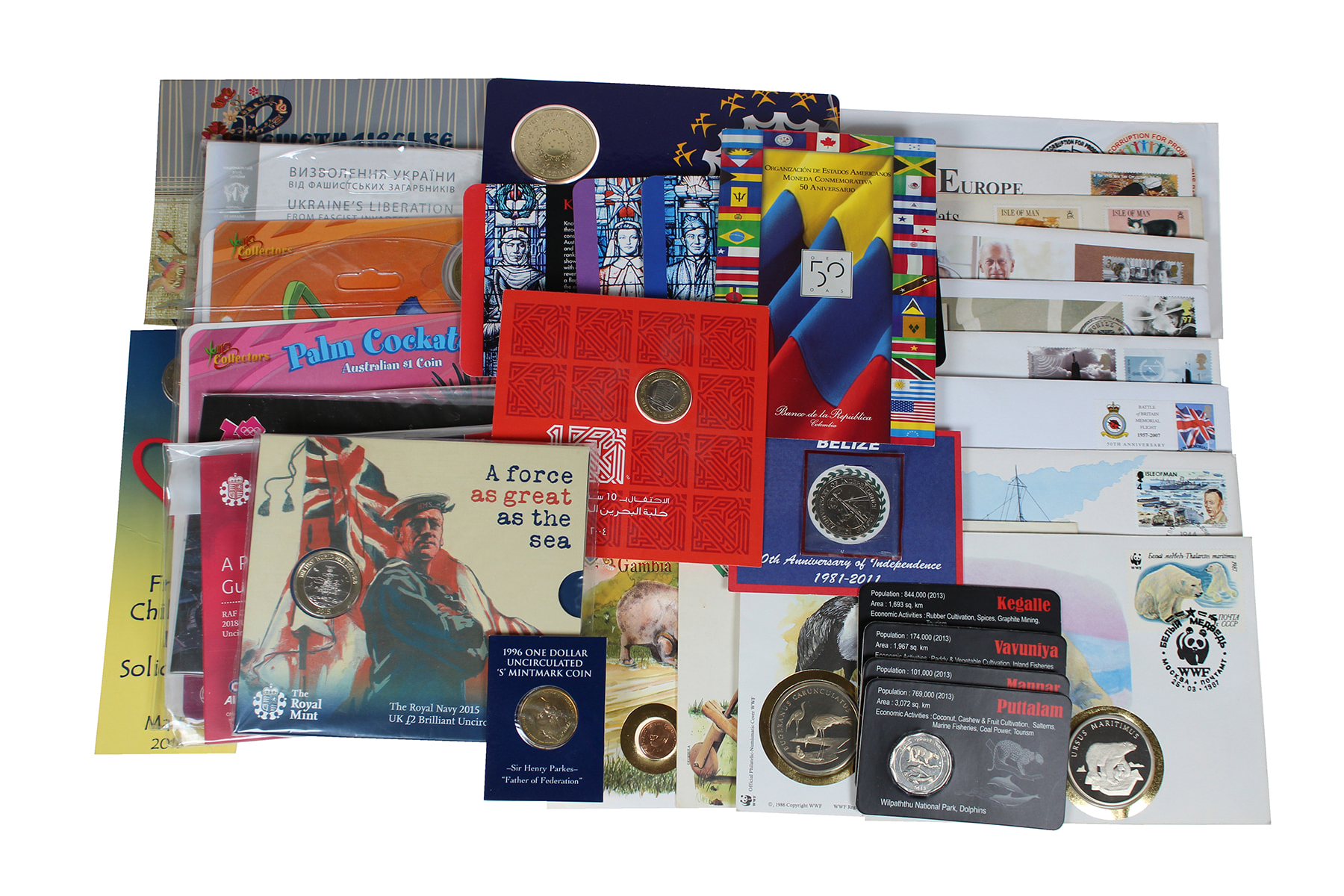Doos met ruim 50 stuks wereldmunten. Speciale uitgiften in de nog originele verpakking. UNC en proof.