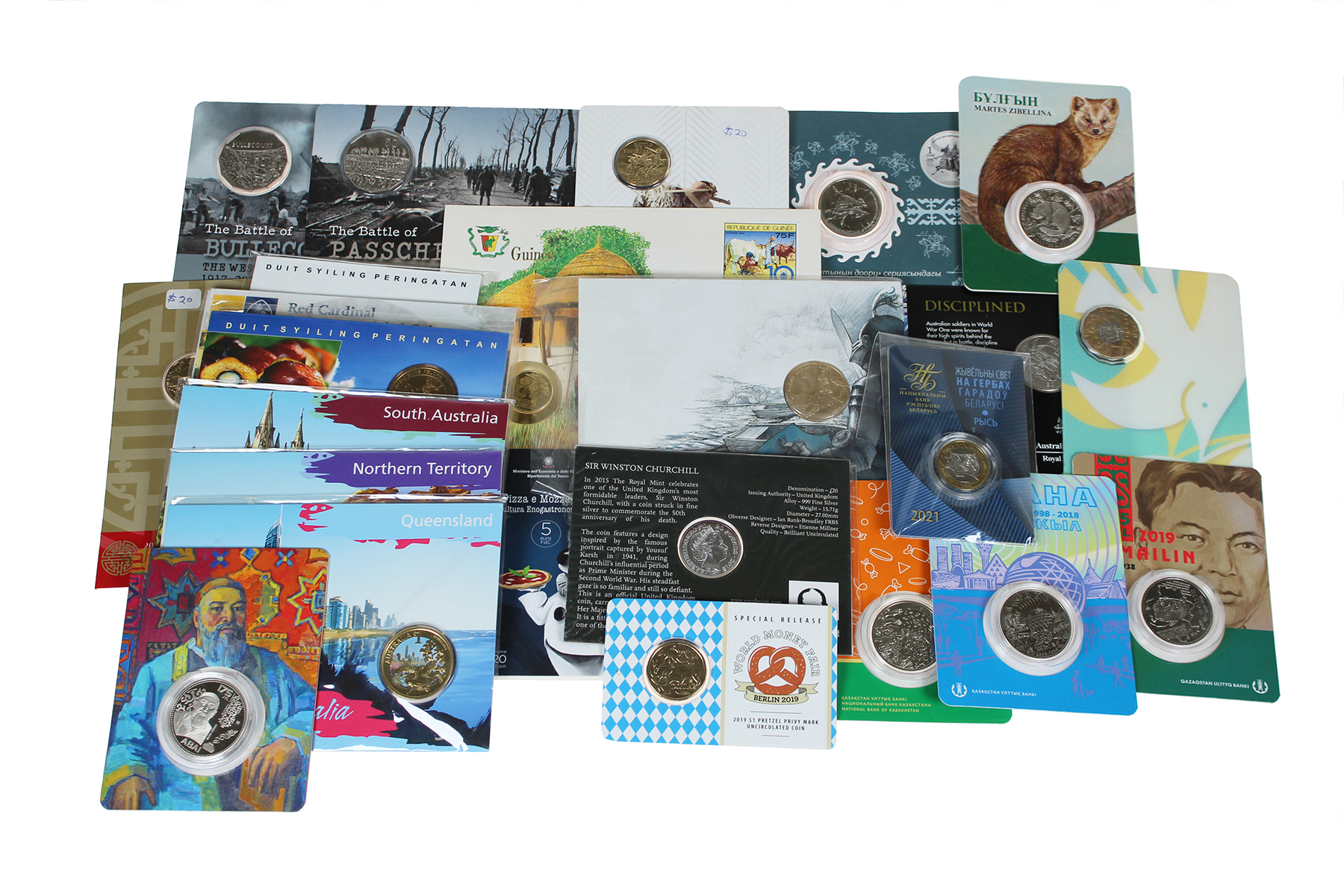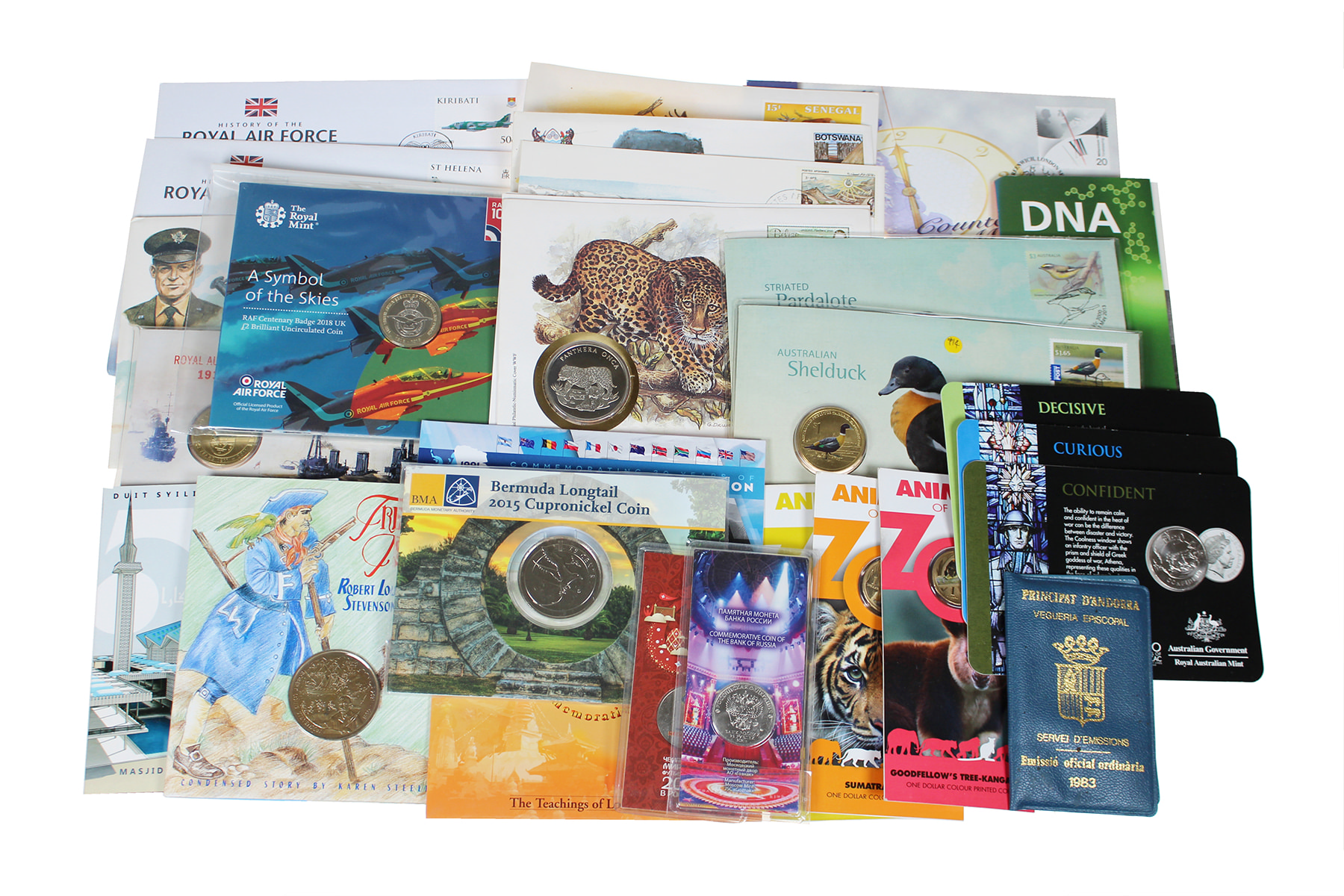 Doos met ruim 50 stuks wereldmunten. Speciale uitgiften in de nog originele verpakking. UNC en proof.