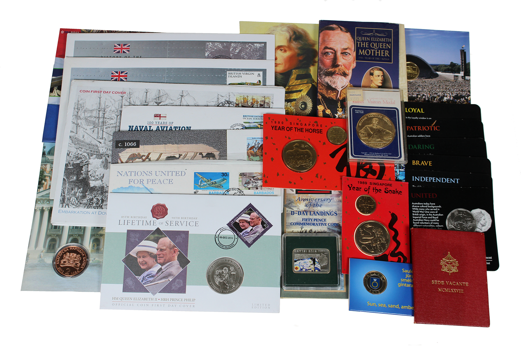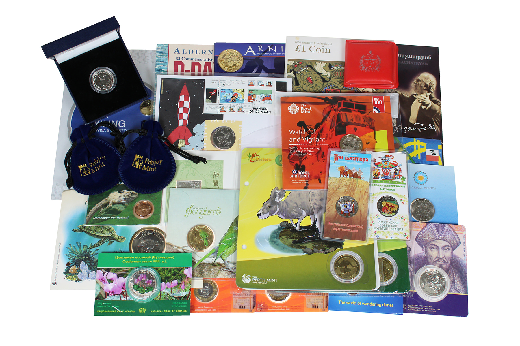 Doos met ruim 50 stuks wereldmunten. Speciale uitgiften in de nog originele verpakking. UNC en proof.