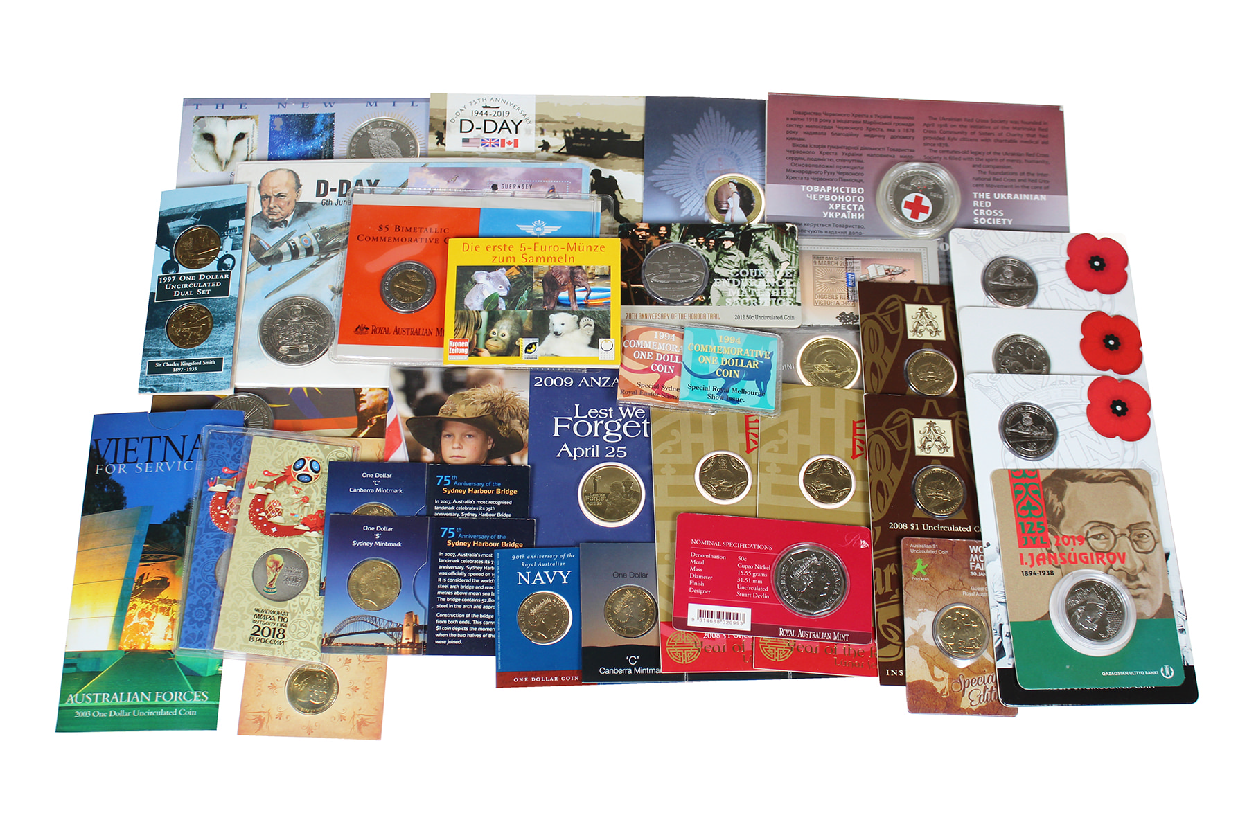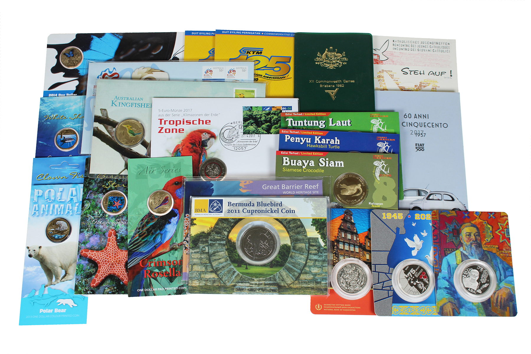 Doos met ruim 50 stuks wereldmunten. Speciale uitgiften in de nog originele verpakking. UNC en proof.
