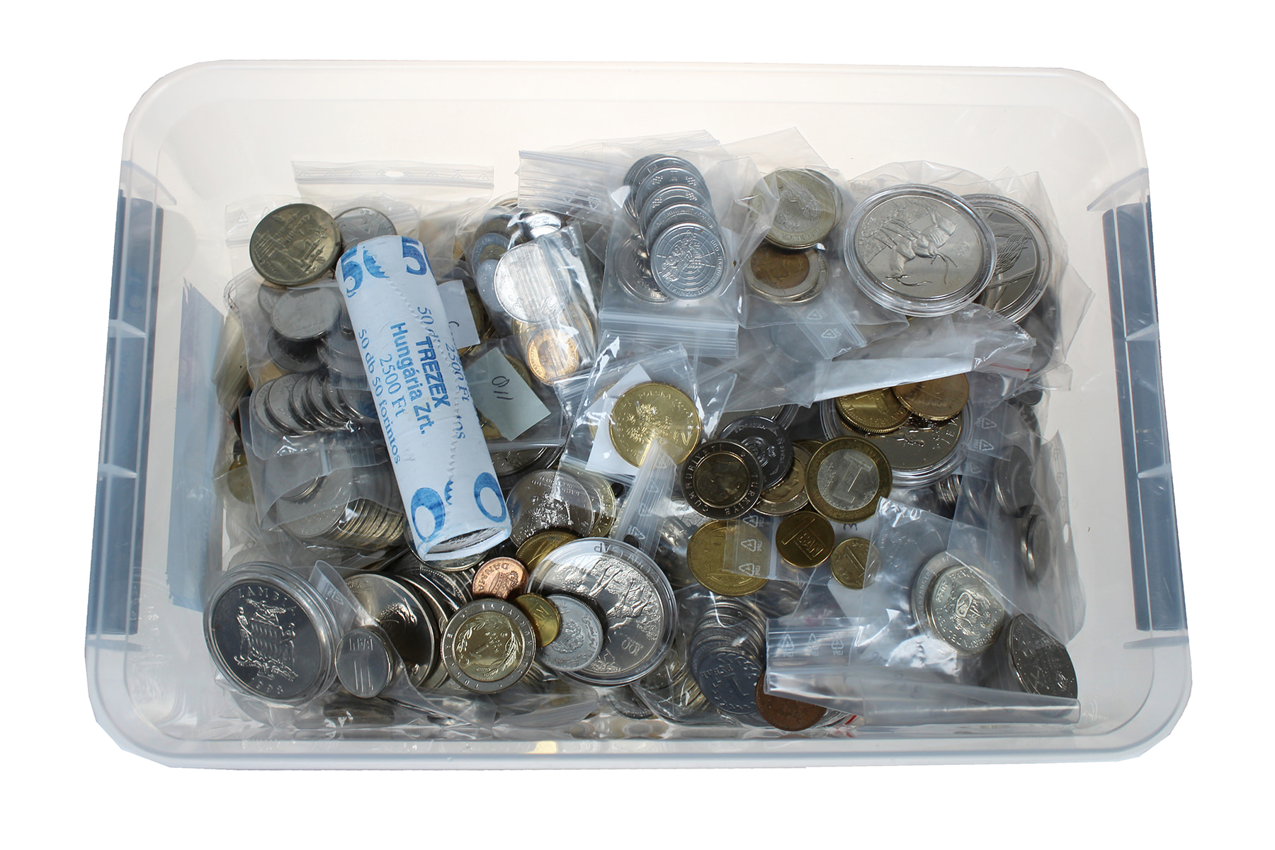 Kunststof bak met premium wereldmunten XXL. Kilogoed waar je geen vieze vingers van krijgt! Voornamelijk UNC.