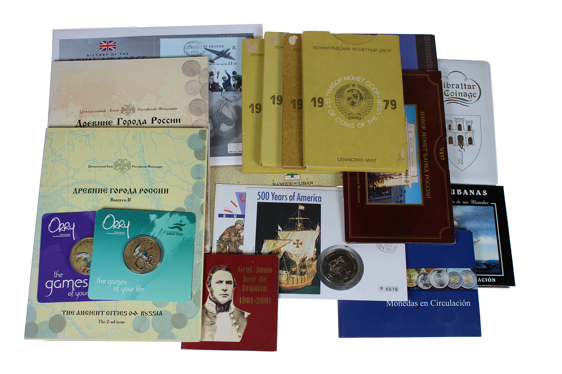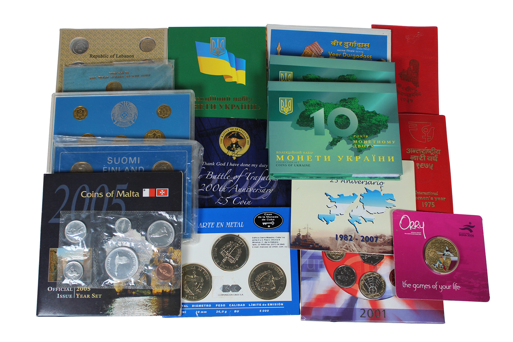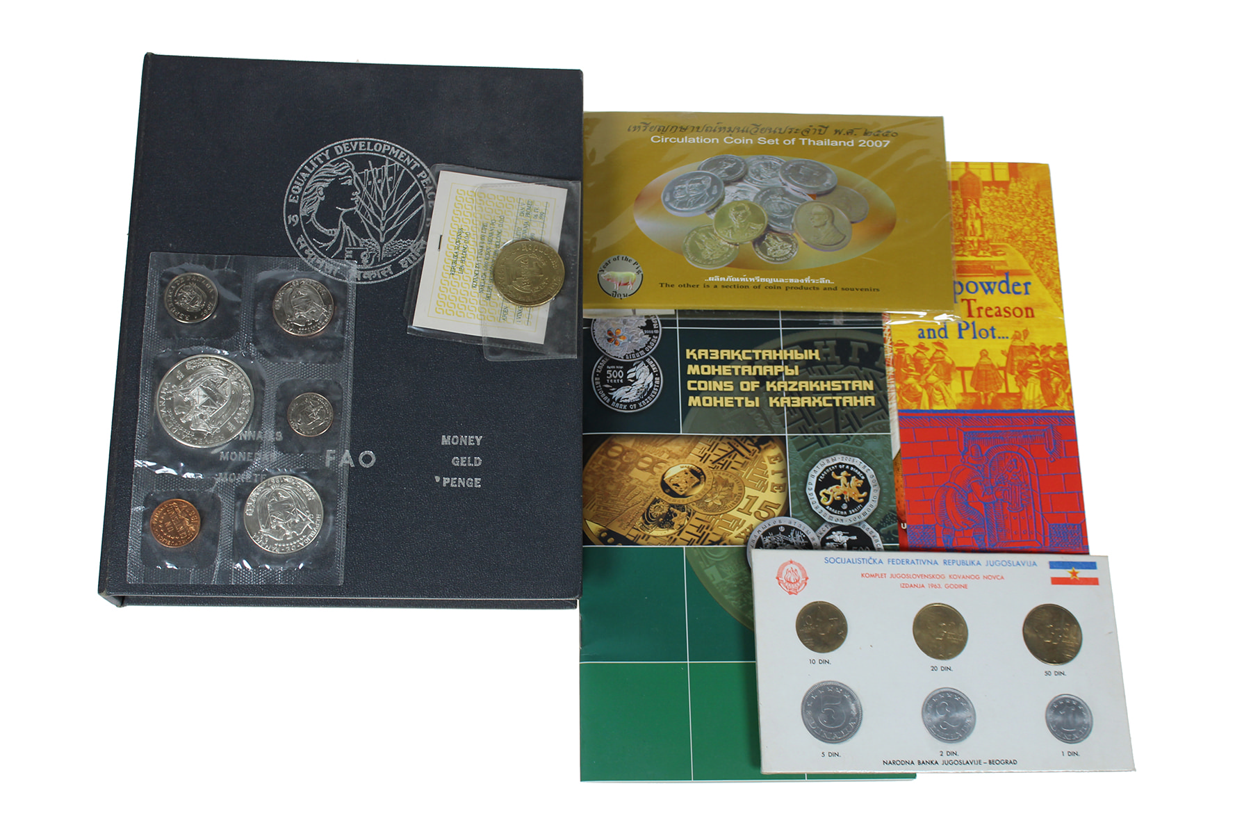 Kunststof bak met muntsetjes wereld, onder meer FAO. Ruim 40 stuks. UNC en proof.