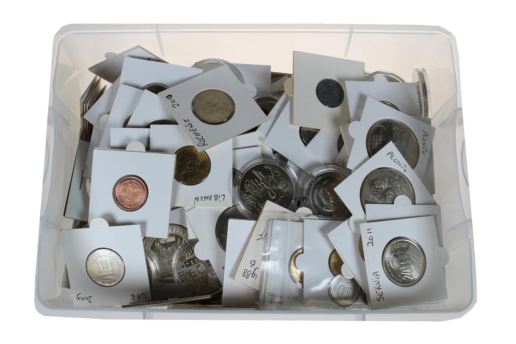 Kunststof bak met onuitgezocht wereld allerlei verpakt in munthouders en capsules. Voornamelijk UNC.