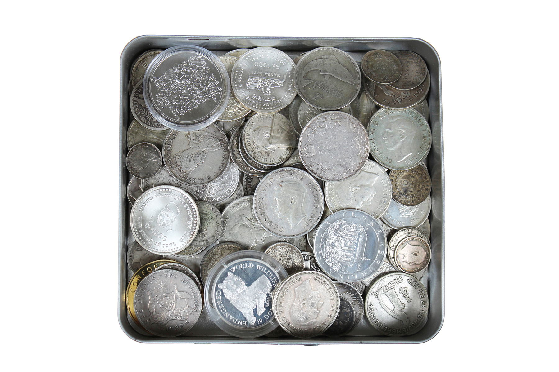 Blikje onuitgezocht wereld allerlei. Vrijwel uitsluitend zilver!
