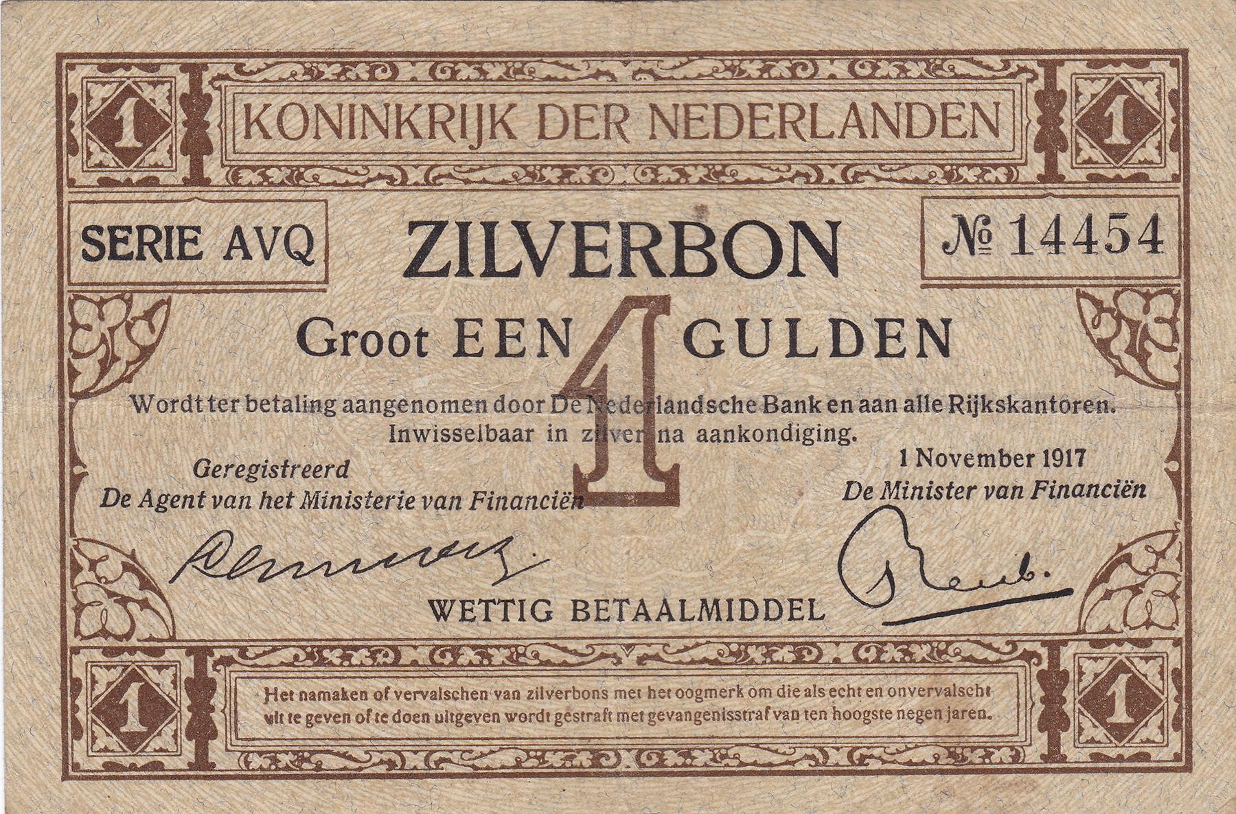 1 Gulden zilverbon 1917. Mev. 02-2b; PL 2.b.b2.a [# AVQ 14454]. Zeer fraai.