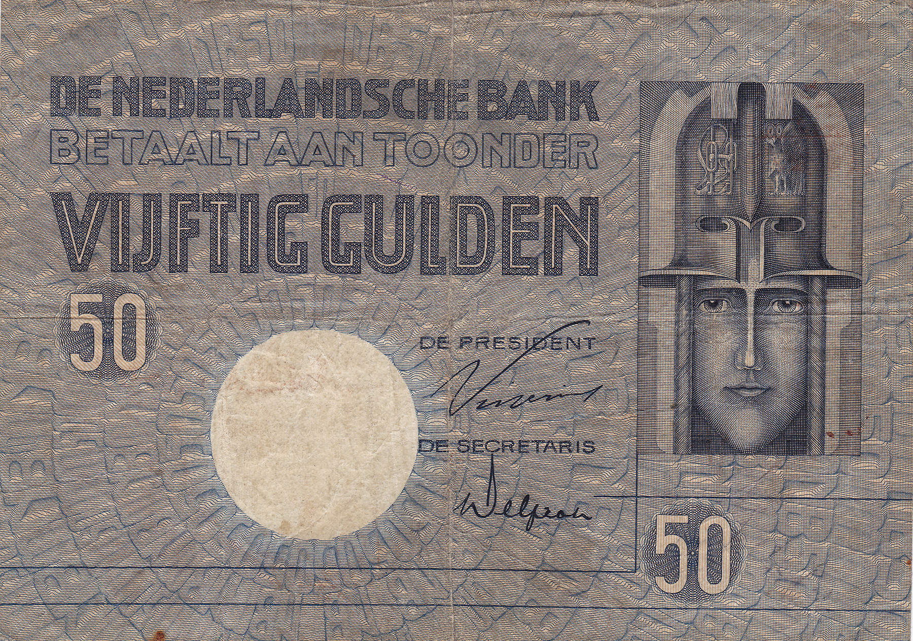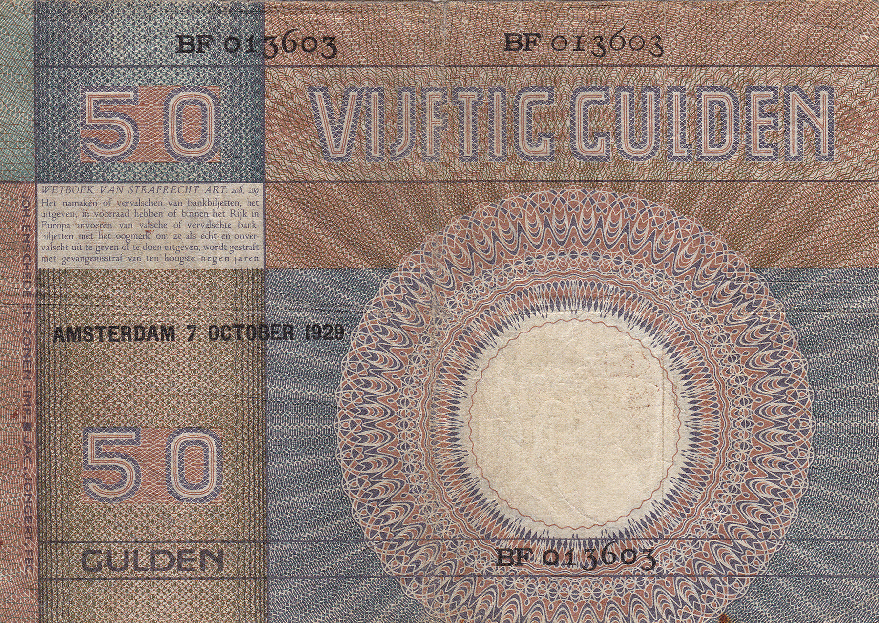 50 Gulden 1929 Minerva. Mev. 96-1b; PL 79.b [# BF 013603]. Roestvlekje, gevouwen. Fraai / Zeer fraai.