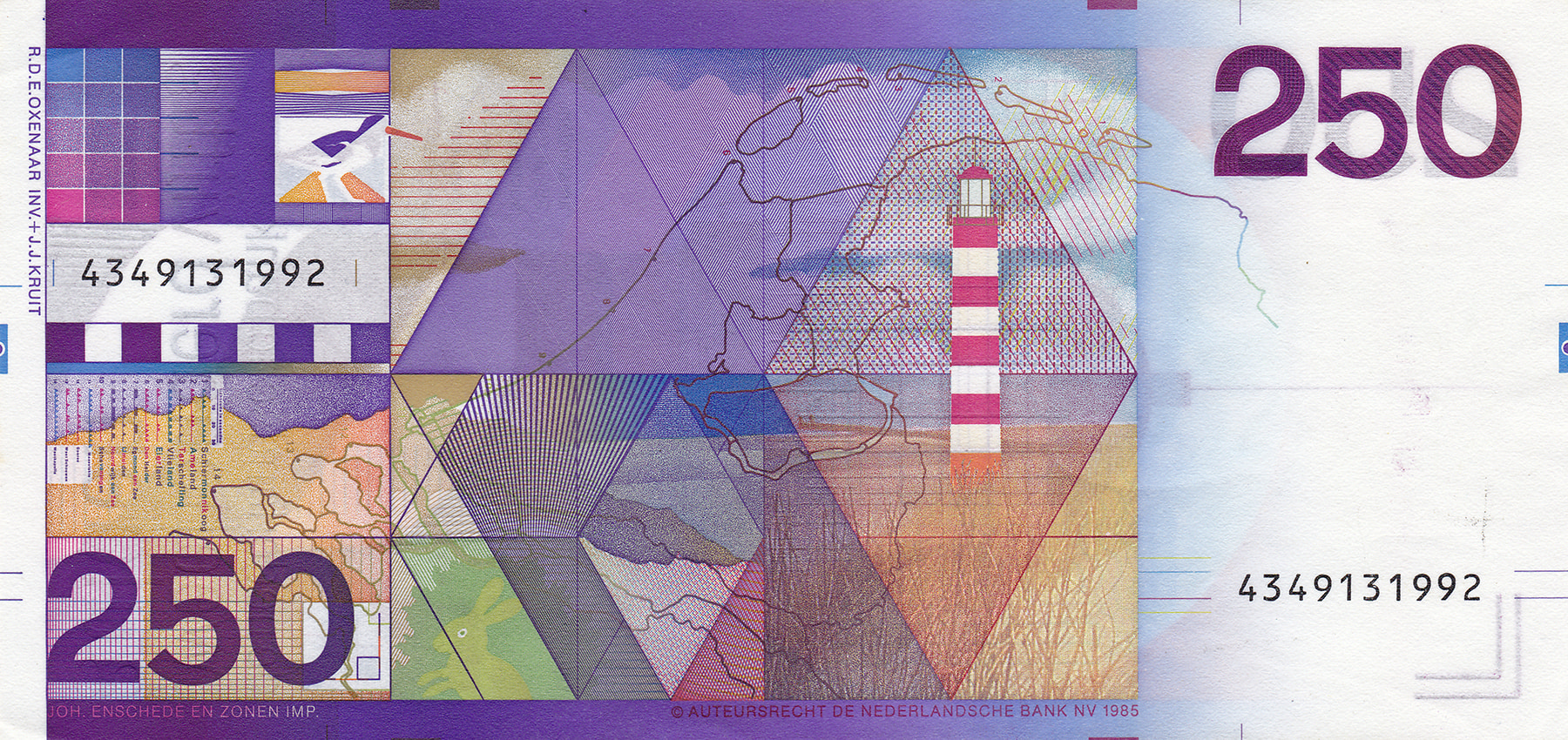 250 Gulden 1985 Vuurtoren. Mev. 134-1; PL 110.a [# 4349131992]. Vrijwel UNC.