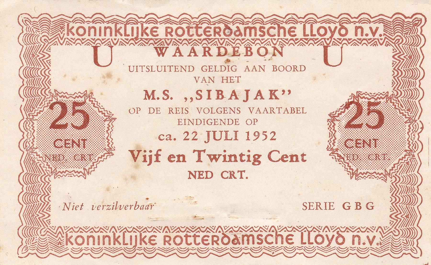 25 Cent Koninklijke Rotterdamsche Lloyd N.V.; s.s. “Sibajak” eindigend op 22 juli 1952.Vgl. Plomp 1614.3c [# U-GBG]. Eén regel m.b.t. verzilvering. Enkele bruine puntjes. Prachtig.