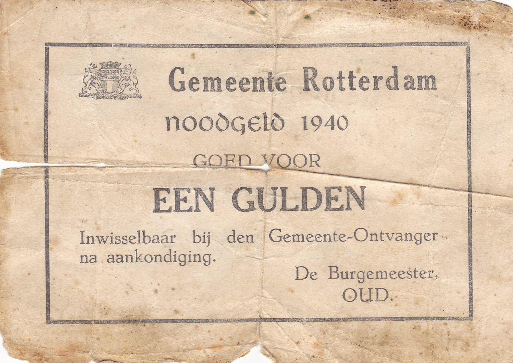 1 Gulden 1940 Gemeente Rotterdam; noodgeld. T/J 110.01; PL 838.1 [# 2478]. Minder dan fraai.