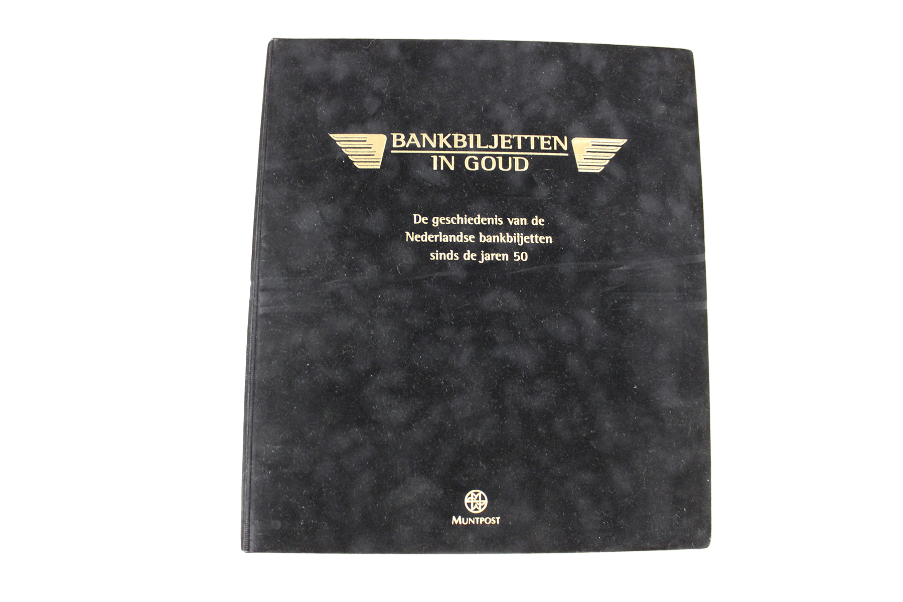 Zwarte velours band “Bankbiljetten in Goud – Geschiedenis van de Nederlandse Bankbiljetten sinds de Jaren ‘50”, met 25 vergulde biljetten incl. info. Uitgegeven door Muntpost.