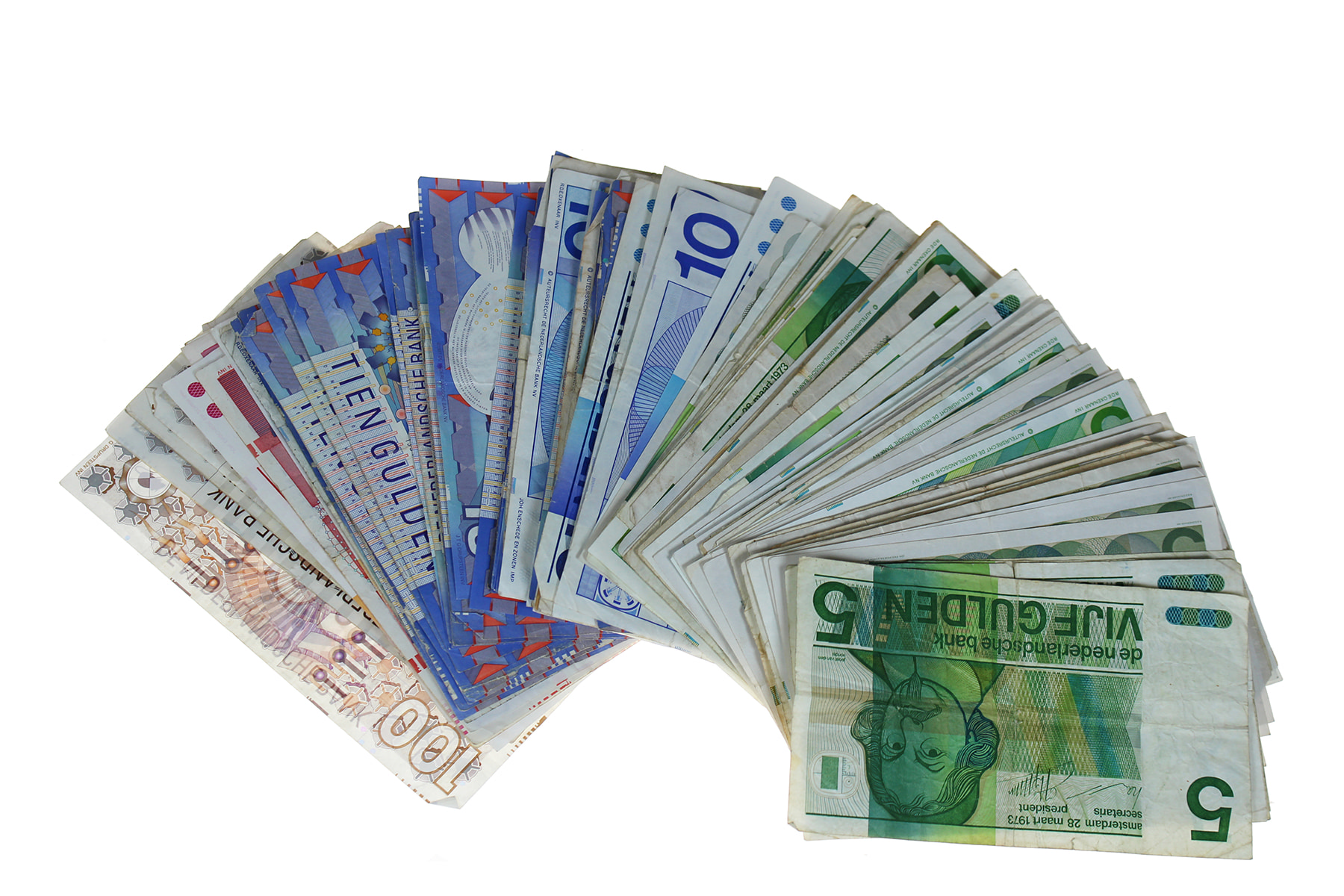 Wit doosje met oud nominaal Nederland 5 t/m 100 Gulden, de meeste veelvuldig in omloop geweest. Totaal Hfl.1.650,-, deels nog inwisselbaar.