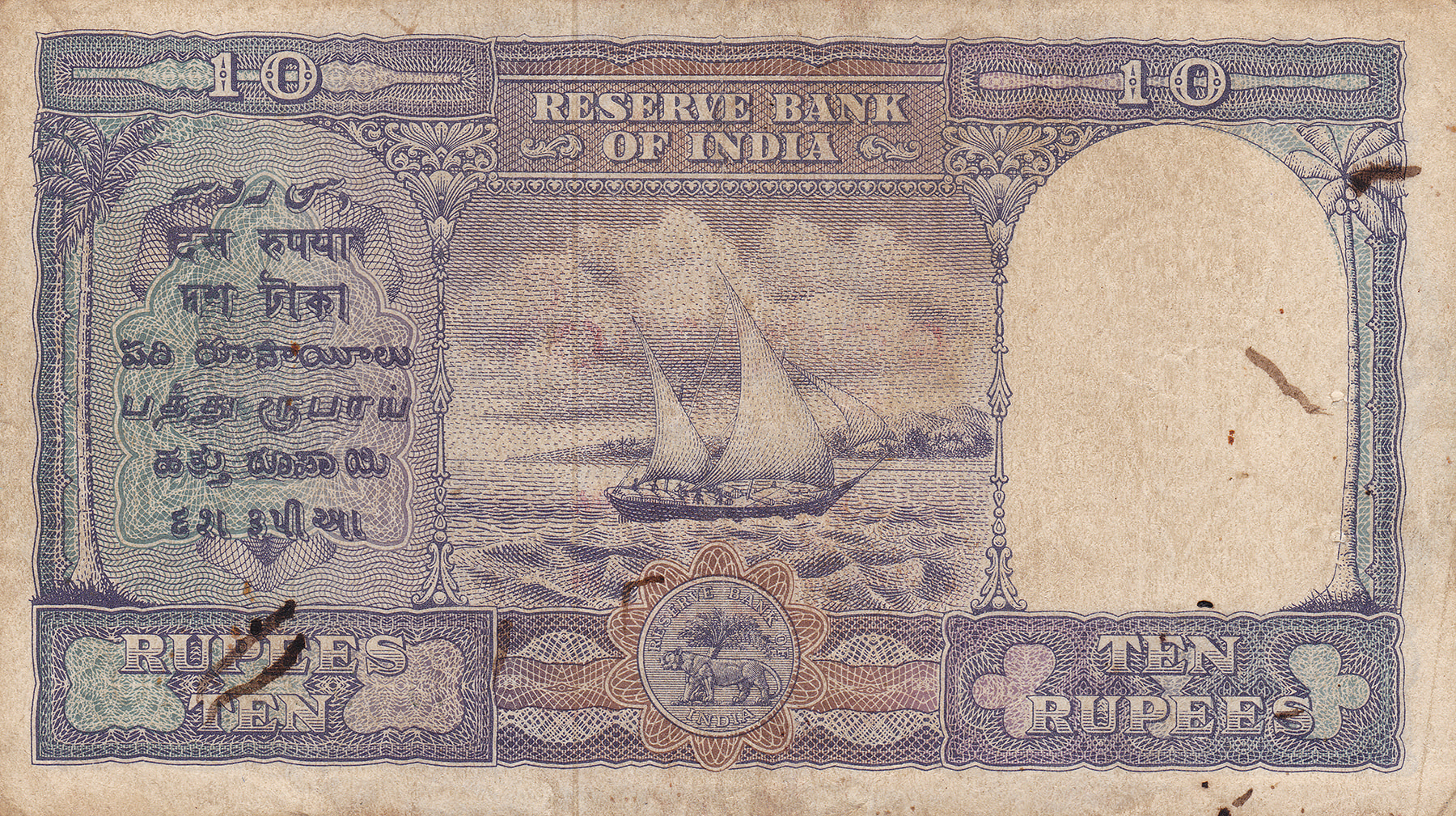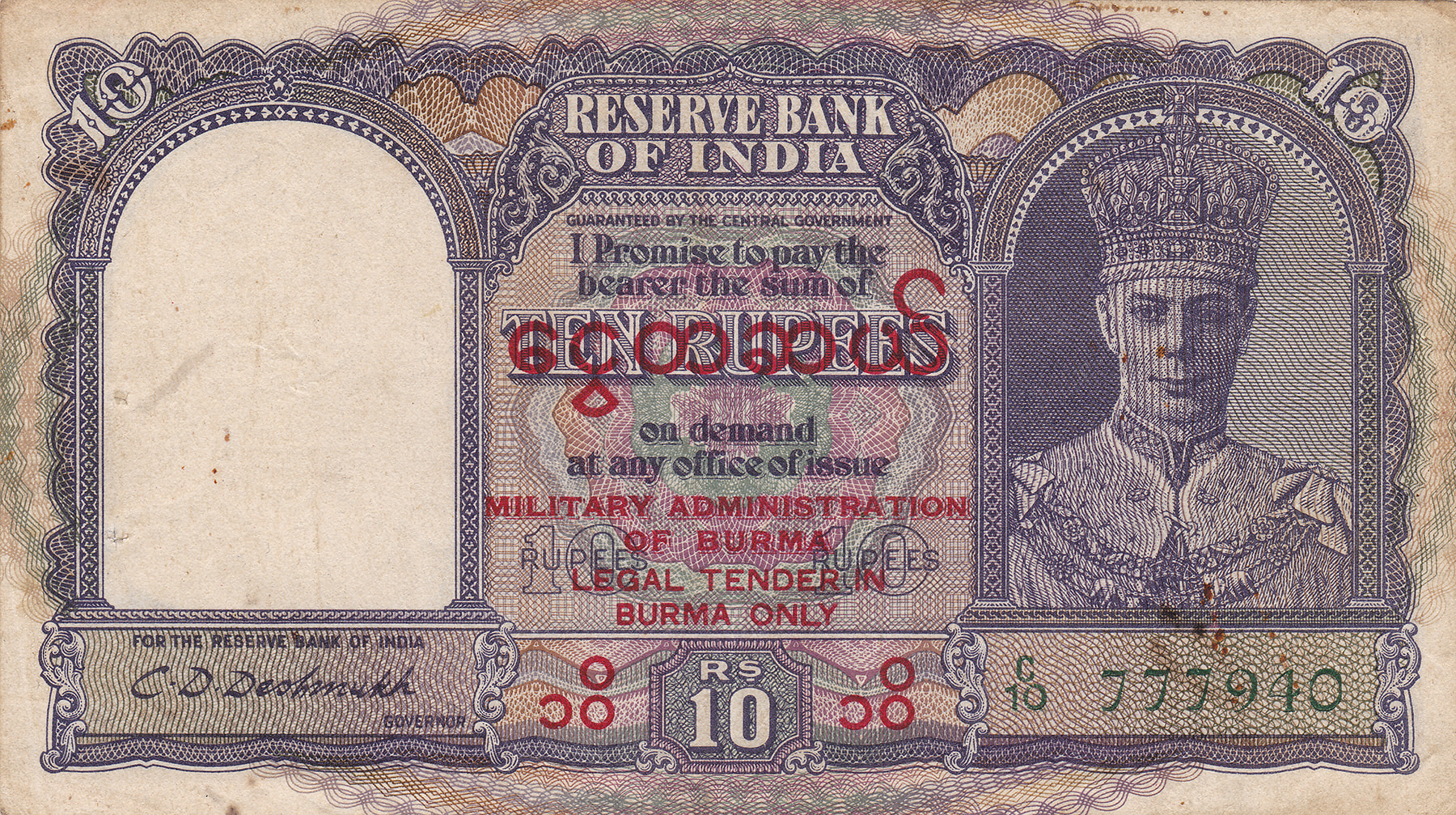 10 Rupees ND (1945). Pick 28. Brown stains. VF.