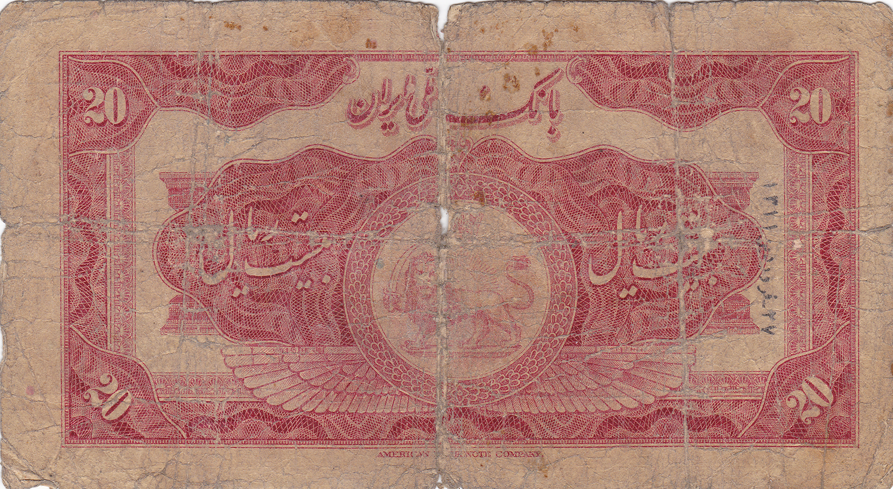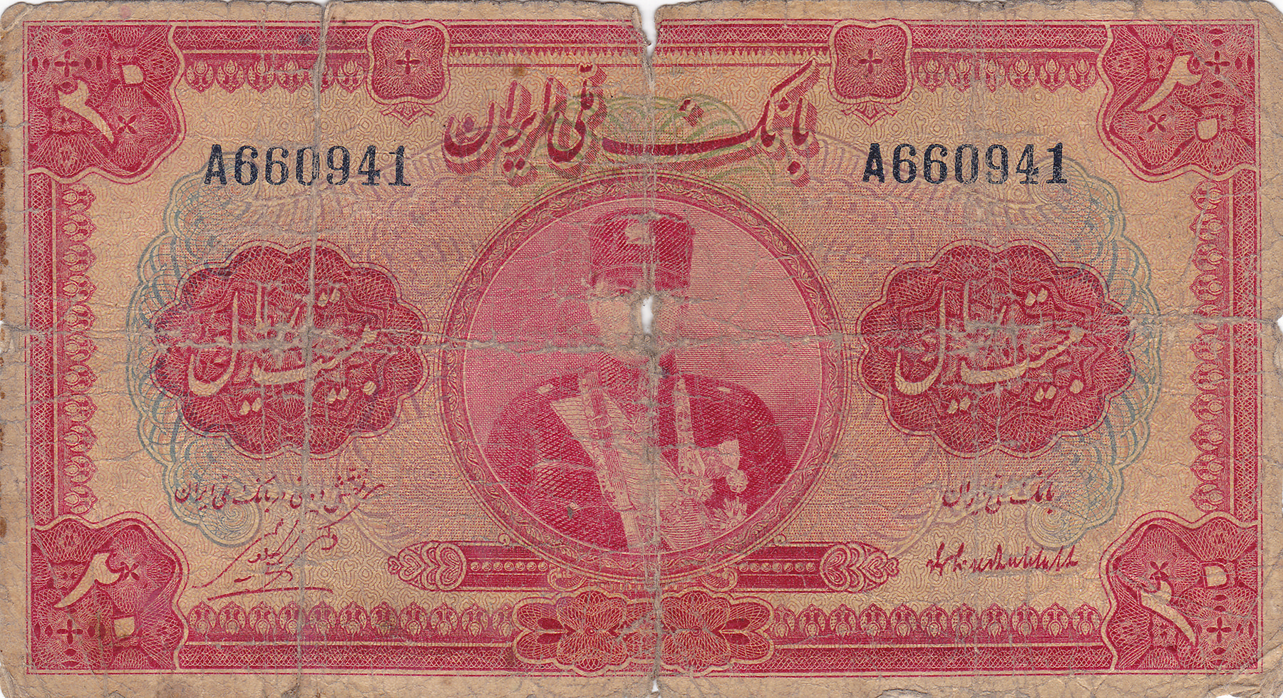 20 Rials AH1311 (1932). Pick 20a [# A660941]. Very, very poor.