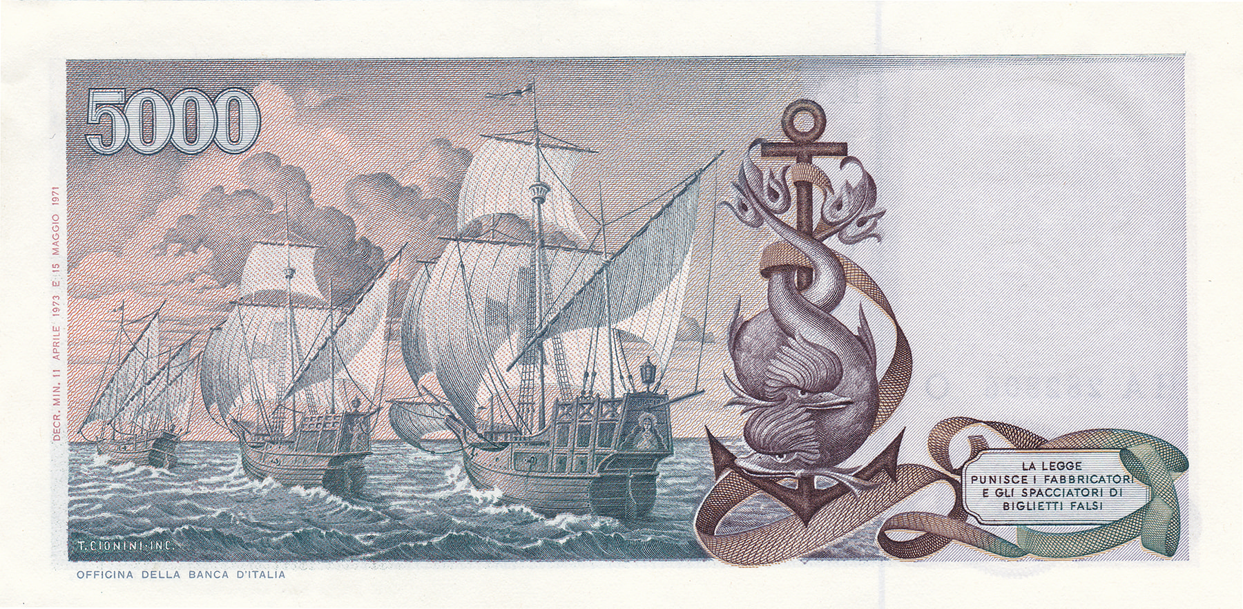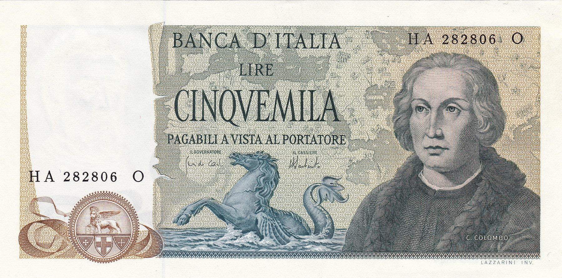 5.000 Lire. Pick 102b [# HA 282806 O]. Almost UNC.