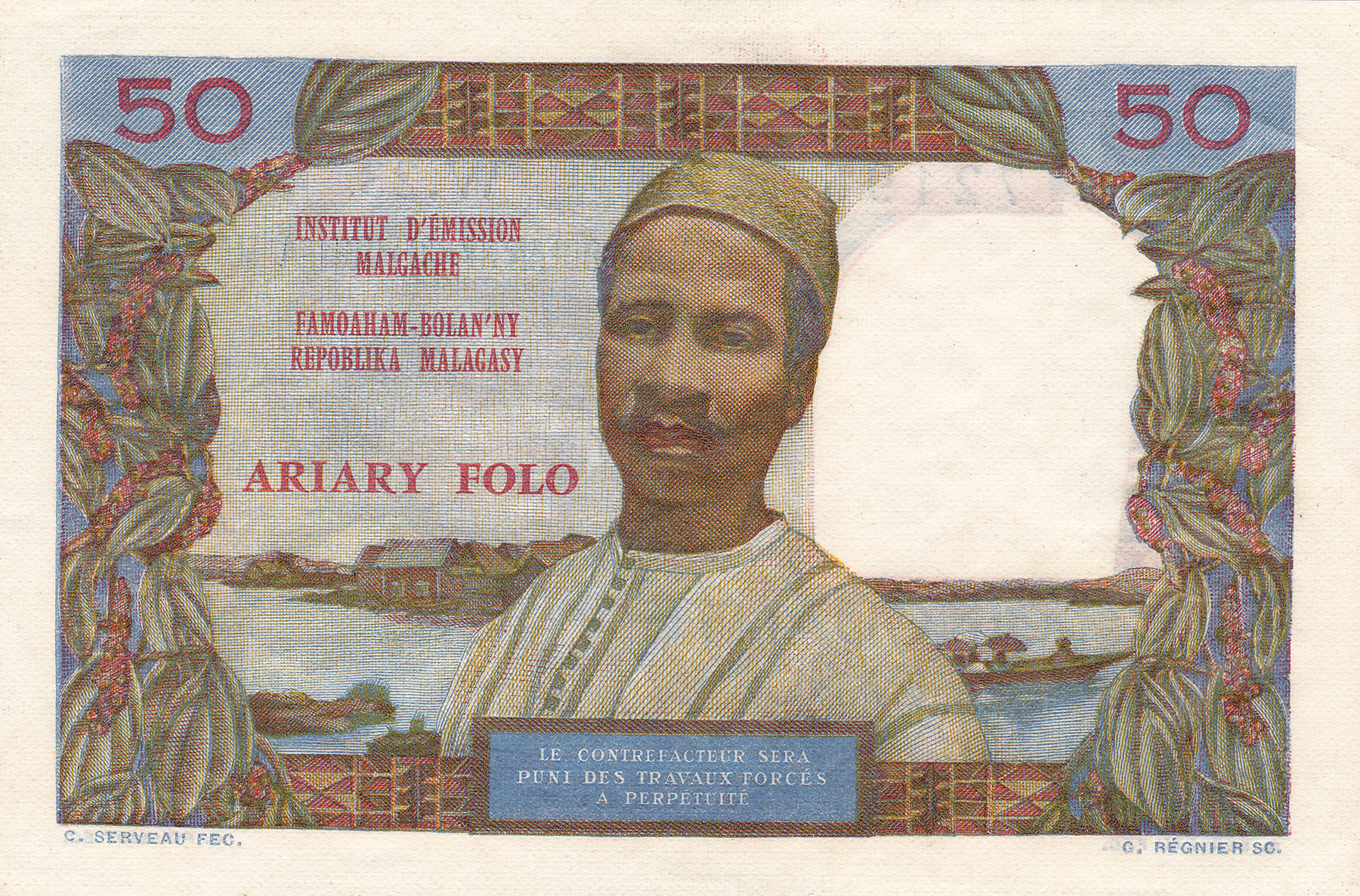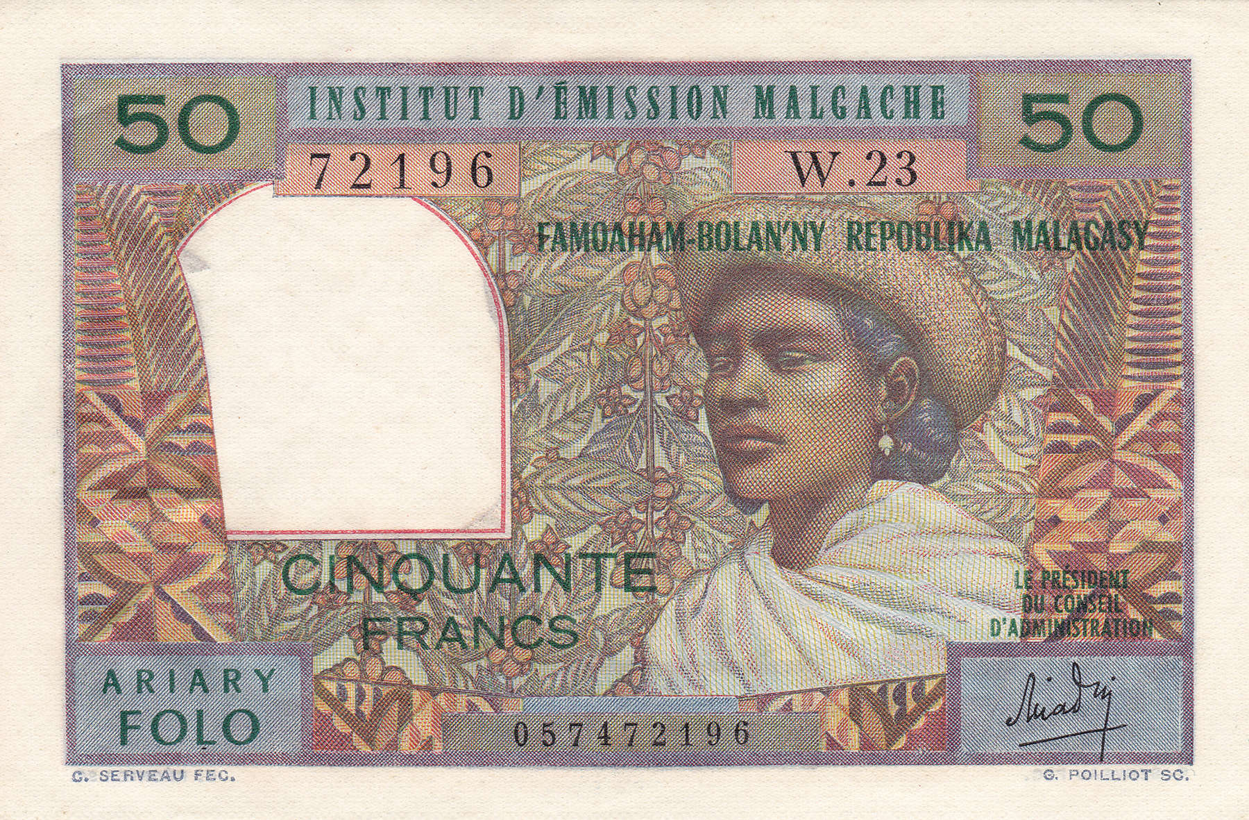 50 Francs - 10 Ariary n.d. (1969). Pick 61 [# 72196 W.23]. Almost UNC.