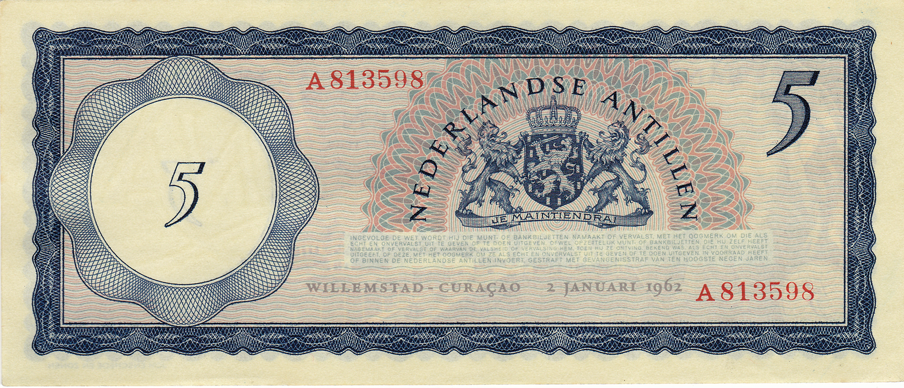 5 Gulden 1962. Pick 1 [#A 813598]. Almost UNC.