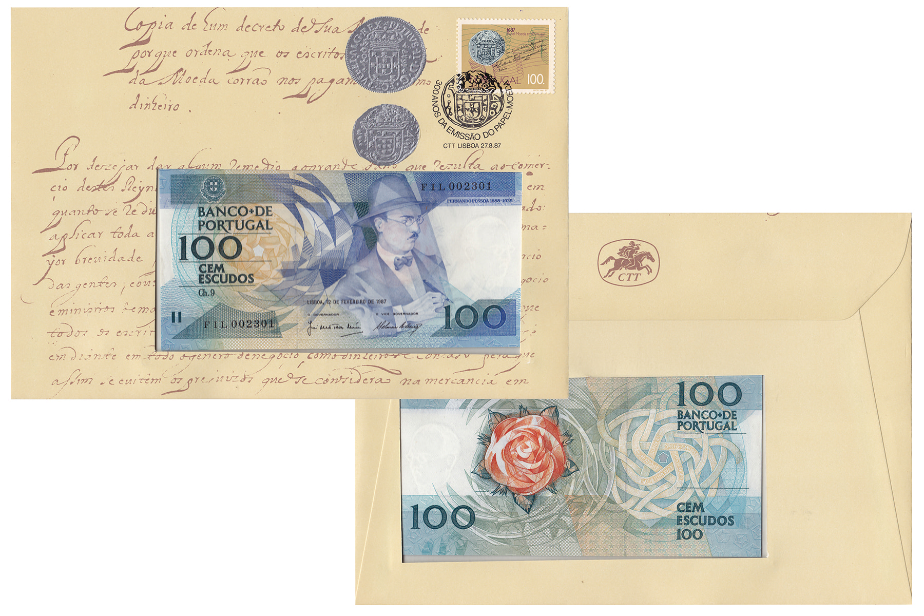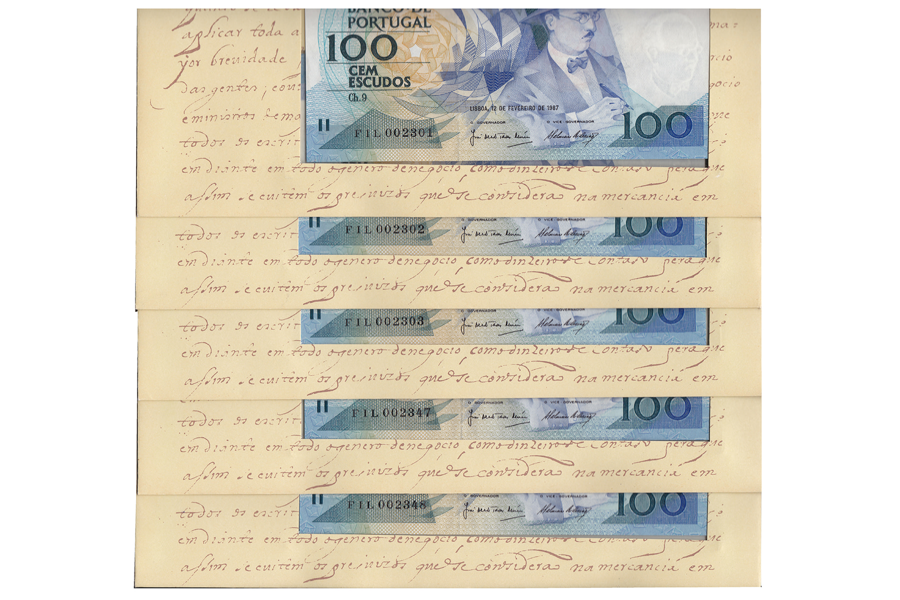 Lot (5) 100 Escudos 1987. Pick 179c [# FIL 002301 t/m 002303, 002347, 002348]. Almost UNC.