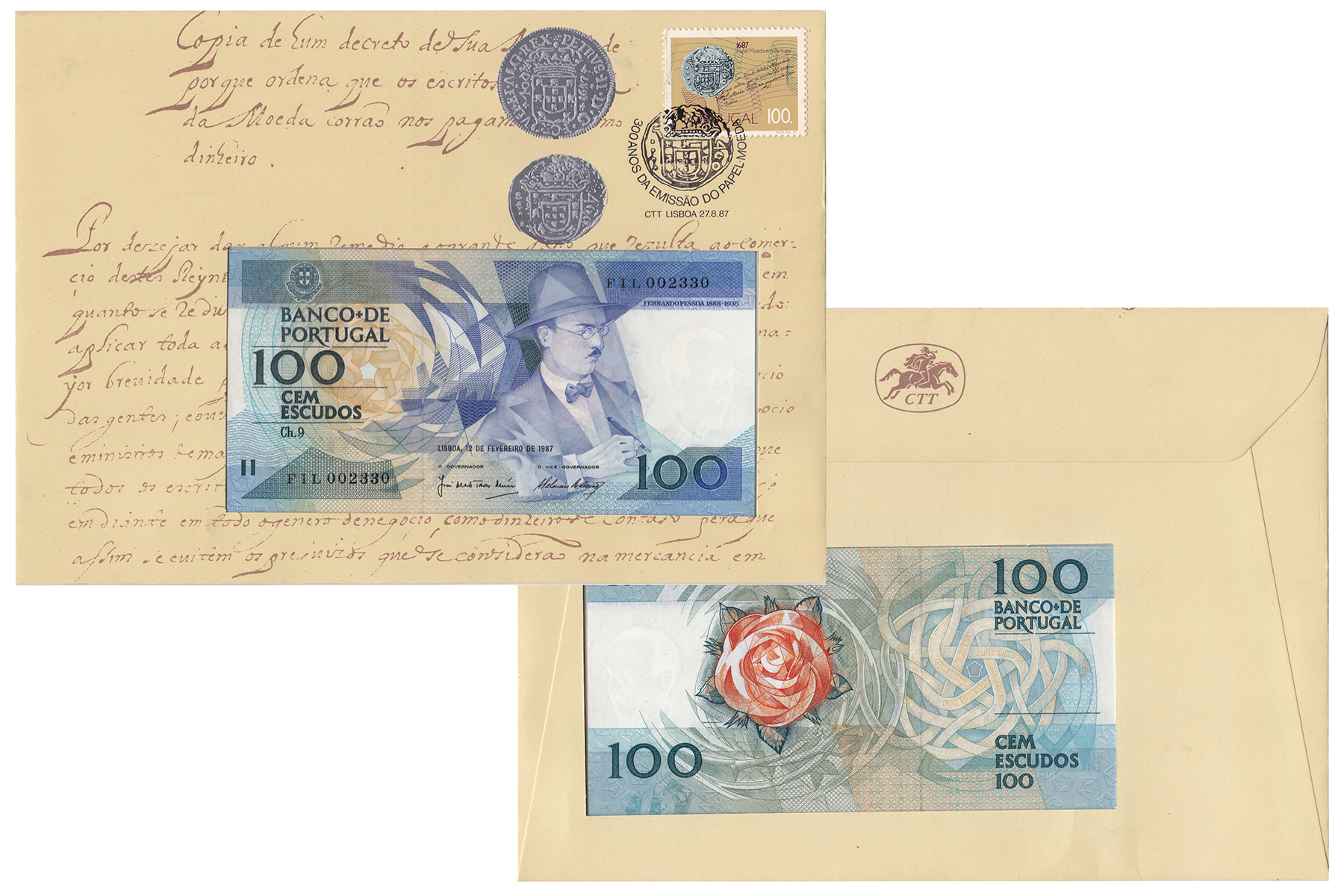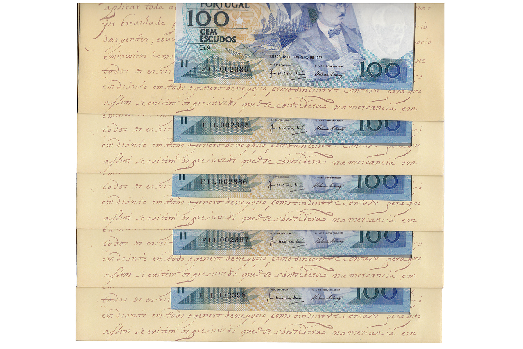 Lot (5) 100 Escudos 1987. Pick 179c [# FIL 002330, 002385, 002386, 002397, 002398]. Almost UNC.