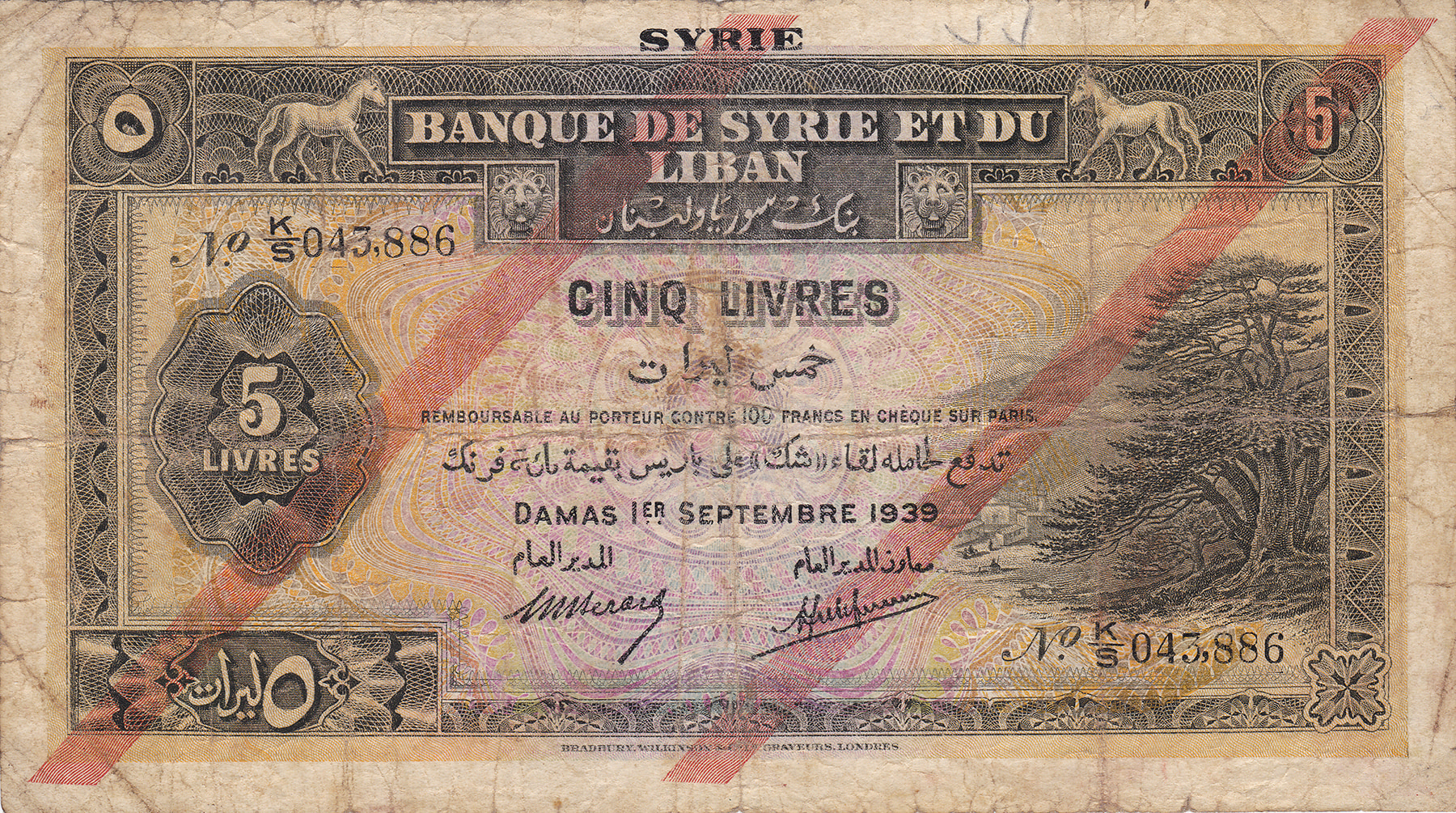 5 Livres 1-9-1939. Pick 41. Poor.