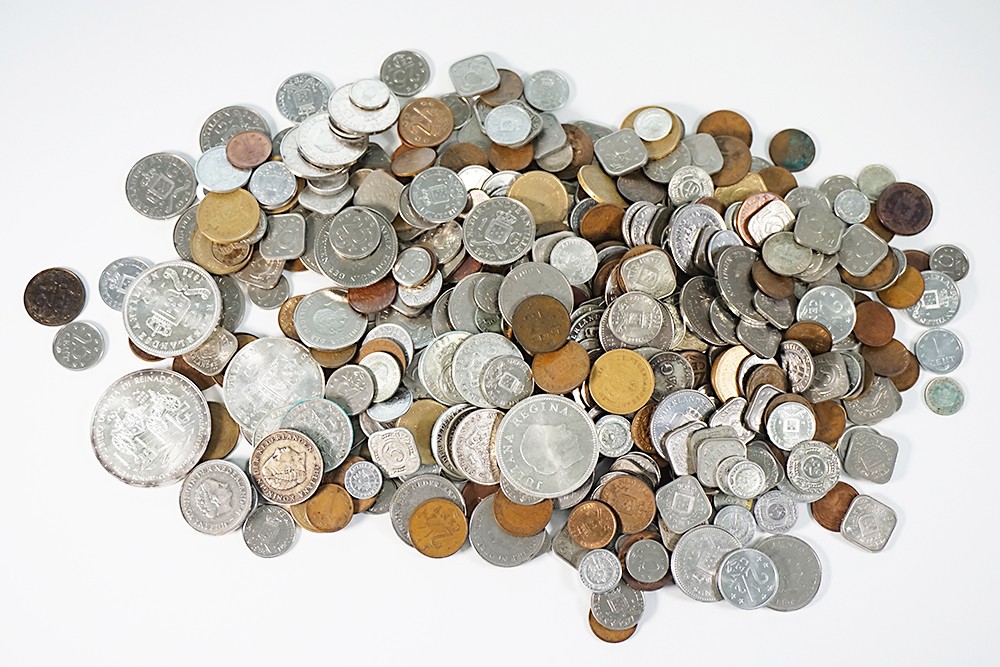 Plastic bakje Antilliaanse pasmunten; ook enig zilver. Bruto 1,82 kg.