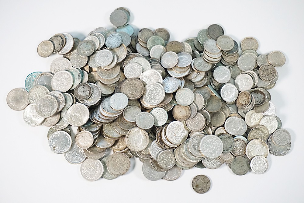 Blikje zilveren dubbeltjes en kwartjes Wilhelmina van het laatste type. Netto zilver: 513 gram.