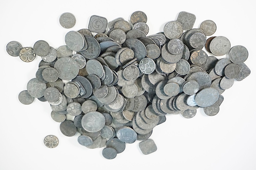 Blikje zinkgeld 2e Wereldoorlog. Centen, 2½ centen, stuivers en kwartjes. Bruto 0,65 kg.