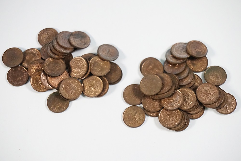 Langwerpige sigarenblikje met halve centen 1885, waarvan veel met originele stempelglans (70).