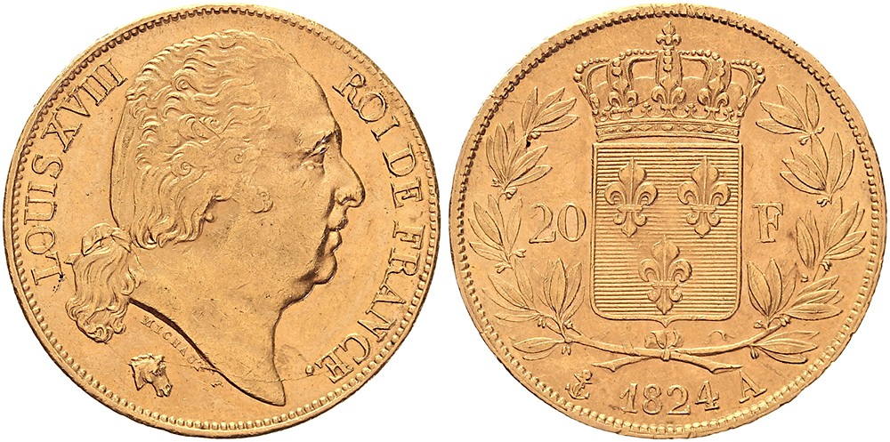 20 Francs 1824A (Paris). Fr. 538; Gad. 1028; KM 712.1. TTB / Superbe (VF / EF).