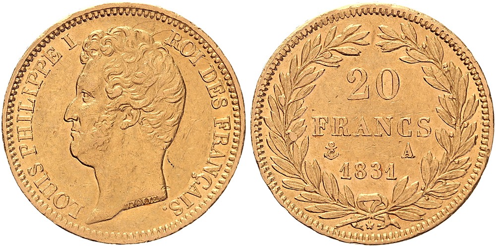 20 Francs 1831A (Paris). Fr. 553a; Gad. 1030a; KM 739.1. TTB (VF).