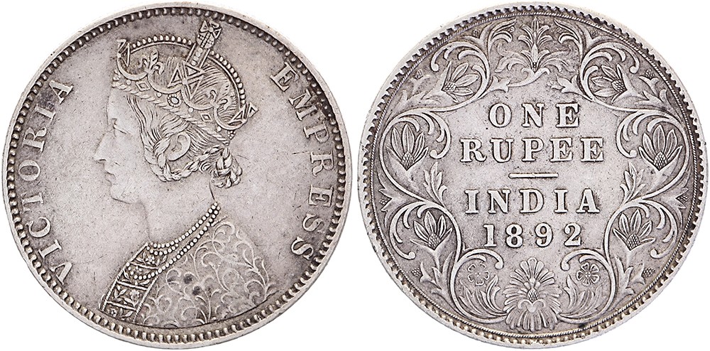 Rupee 1892 B incuse. KM 473.2. EF.