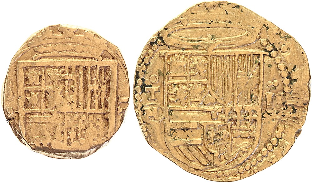 Lot (2) 2 Escudos Sevilla & 2 Escudos Toledo, cob type. Fr. 189, 193. Illegible dates. Gross weight: 13,45 gr.