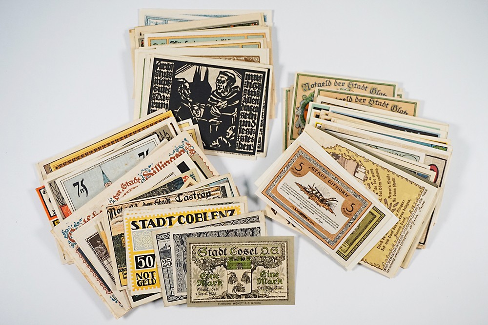 Lot met o.a. 250 stuks stedengeldbiljetten (noodgeld). Vrijwel allen verschillend.