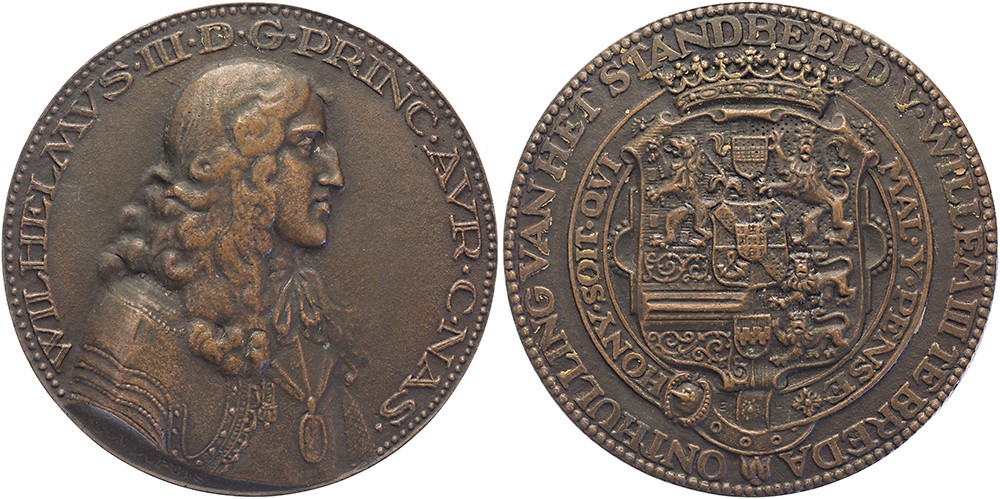 1921 Breda. Onthulling standbeeld stadhouder Willem III. Geharnast borstbeeld naar rechts. / Gekroond wapen omgeven door de spreukband v.d. Orde der Kouseband. Æ gegoten 82. KB II-170. Datum in rand. Toon Dupuis & Ed. Hüttl. Prachtig.