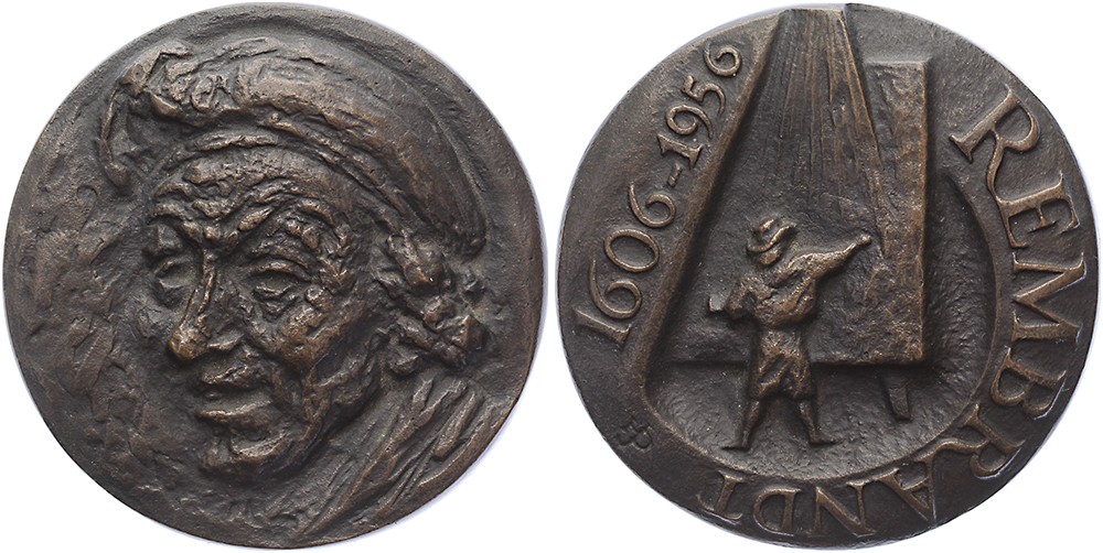 1956 350e Geboortedag Rembrandt. Hoofd Rembrandt iets naar links. / Schilder in Atelier.Æ gegoten 65. KB V-2275. H.D. Janzen. Prachtig.