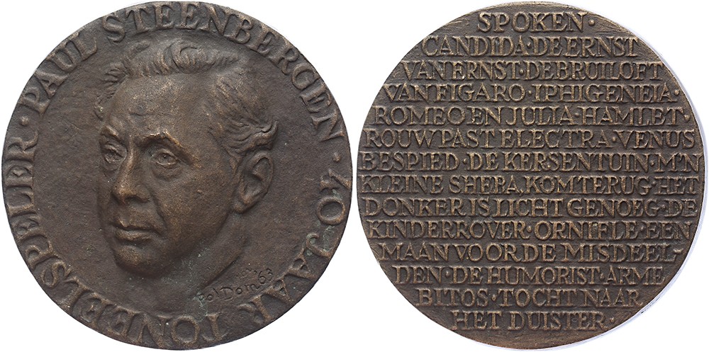 1963 Paul Steenbergen 40 jaar toneelspeler. Hoofd Paul iets naar links. / Titels toneelstukken waarin Steenbergen figureerde. Æ gegoten 84. KB VI-2783. Pol Dom & (Willem Vis). Prachtig.