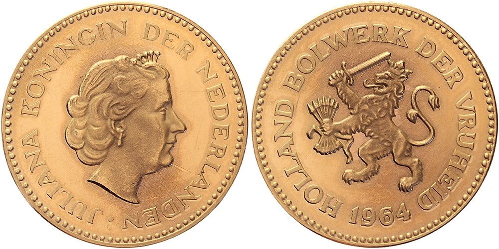1964 Koningin Juliana 55 jaar. Hoofd Juliana naar rechts. / Staande leeuw met geheven zwaard en pijlenbundel. AU 39 [50,08 gram, 900/1000]. Geurt Brinkgreve. Prachtig / FDC.