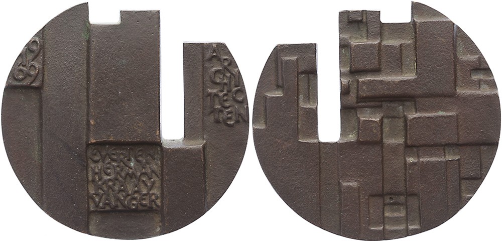 1969 Rotterdam. Architectenbureau Kraaijvanger. Rechthoekige vlakken, gebouwen symboliserend. / Plattegrond van rechthoekige vlakken. Æ gegoten 72 met inkepingen. KB VI-3570; Beeldenaar 2002, nr. 65. (Eric Claus). Prachtig.