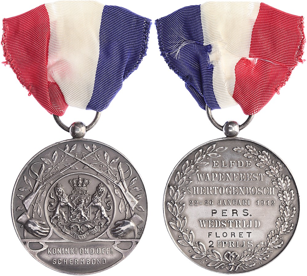 1912 Elfde Wapenfeest te ’s-Hertogenbosch gehouden. In midden zeer fraai Rijkswapen met daarboven twee lauwerkransen, twee geweren en twee sabels. / Lauwerkrans rondom met daarin achtregelige tekst. AR 47. KB I-1008. Met draagoog en ringetje en rood-wit-blauw lint. Prachtig.
