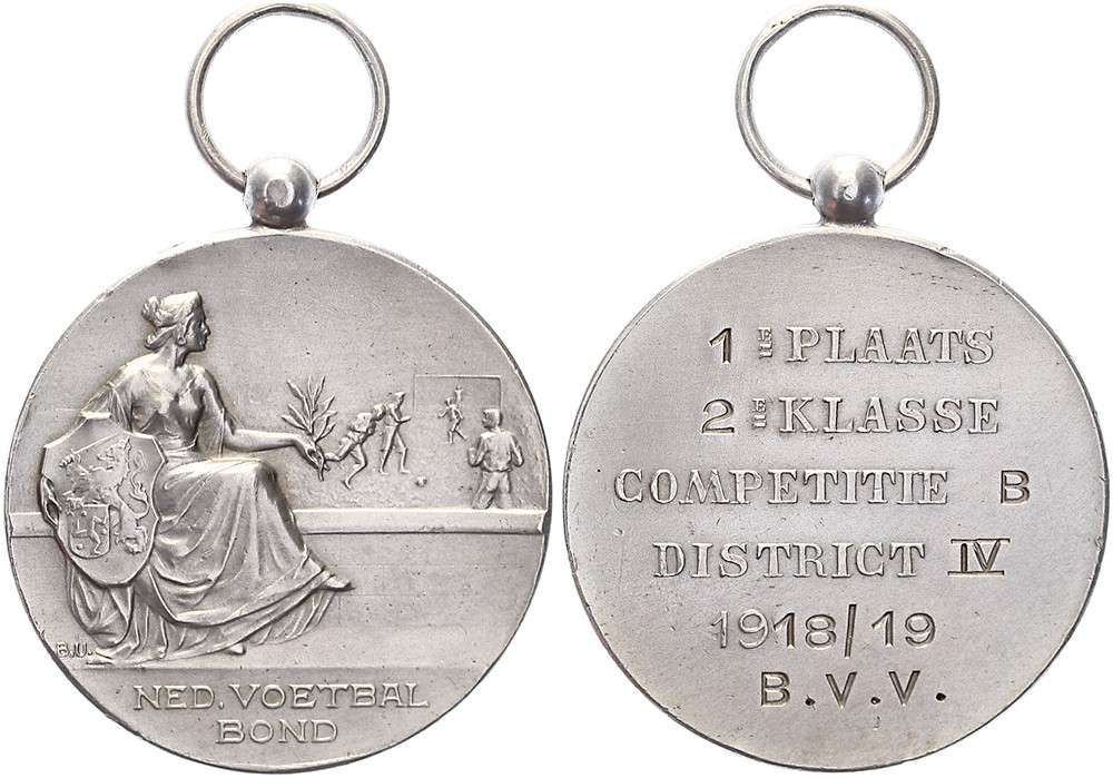 1918/1919 Voetbalpenning van de Bossche Voetbal Vereniging B.V.V. – Kampioen van de 2e klasse te ’s-Hertogenbosch. Zittende vrouw met lauwertak en Bondswapen. / Zesregelige tekst. AR 35. KB 657/9. Met draagoog en draagring. J.J. van Goor. Prachtig.